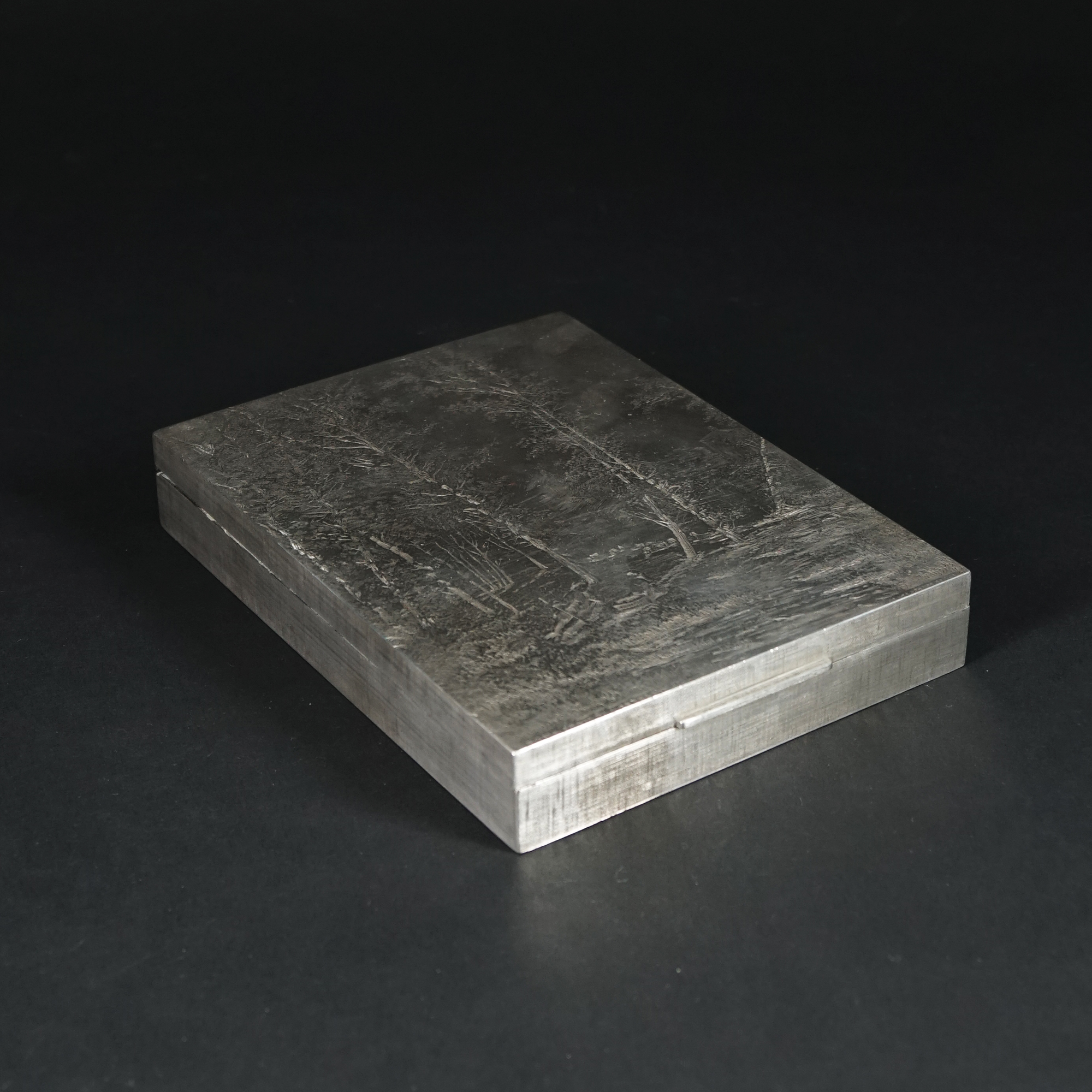Scatola portasigarette di forma rettangolare in argento sterling a superficie satinata; coperchio incernierato inciso a raffigurare Roma, Prati di Castello, da una stampa antica. All'interno una decorazione a fiorellini stilizzati.