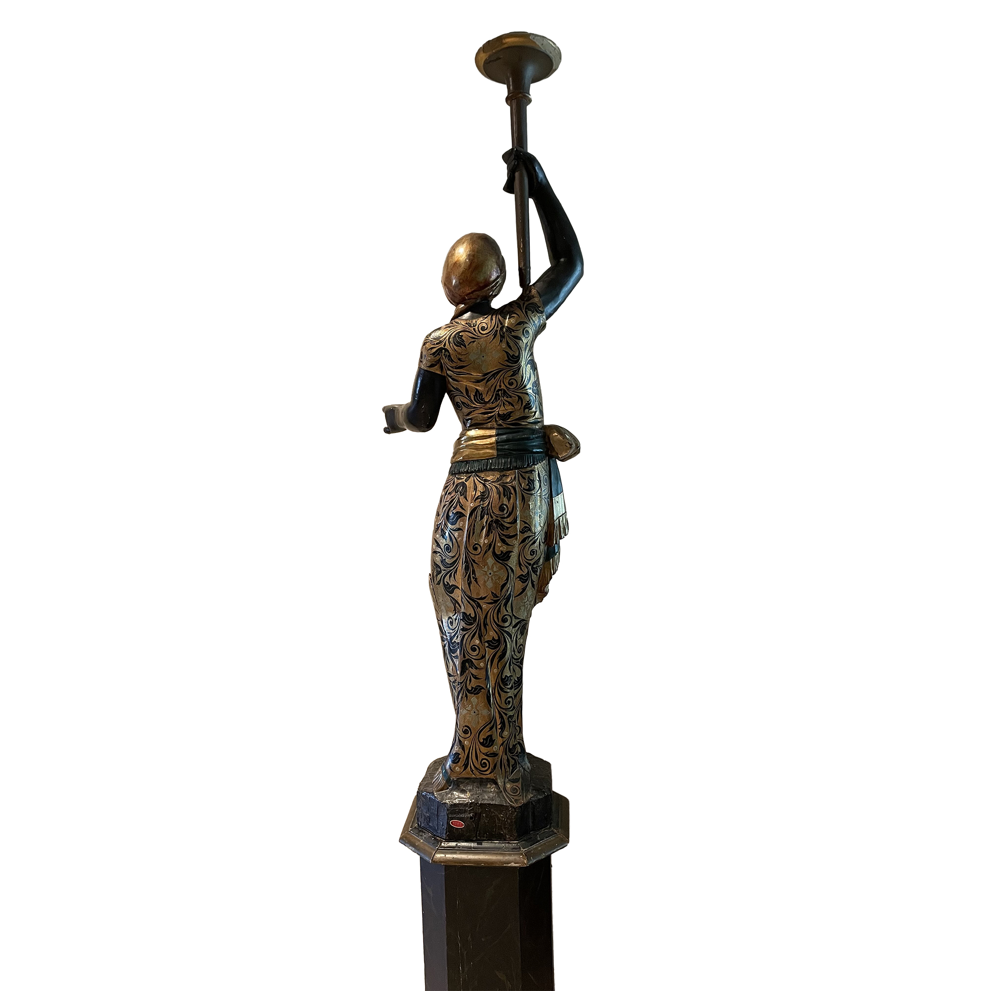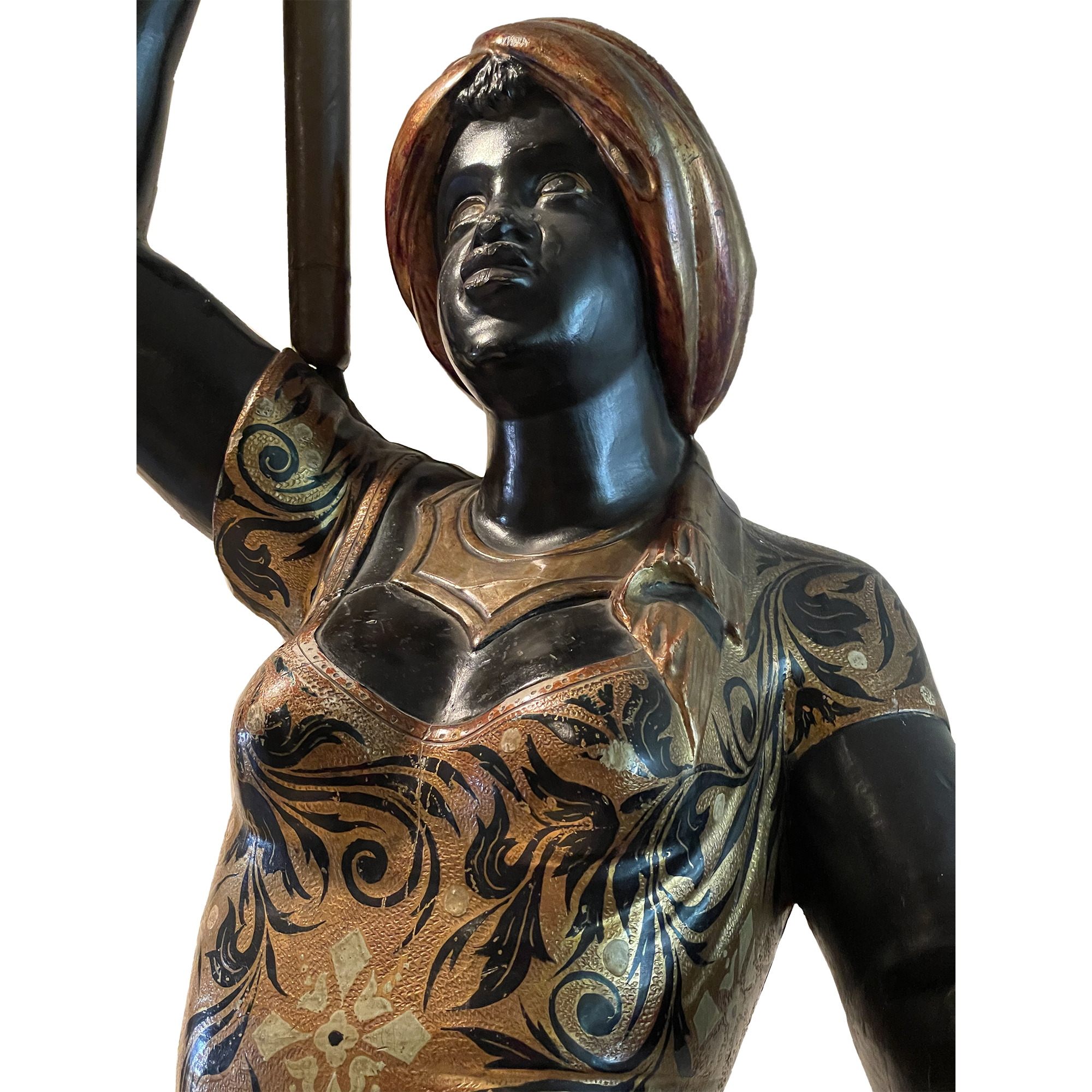Coppia di sculture in legno ebanizzato e dipinto in policromia e oro raffiguranti rispettivamente un uomo e una donna mori: le vesti panneggiate; il capo coperto da un turbante. Alto piedistallo a sezione ottagonale.