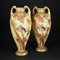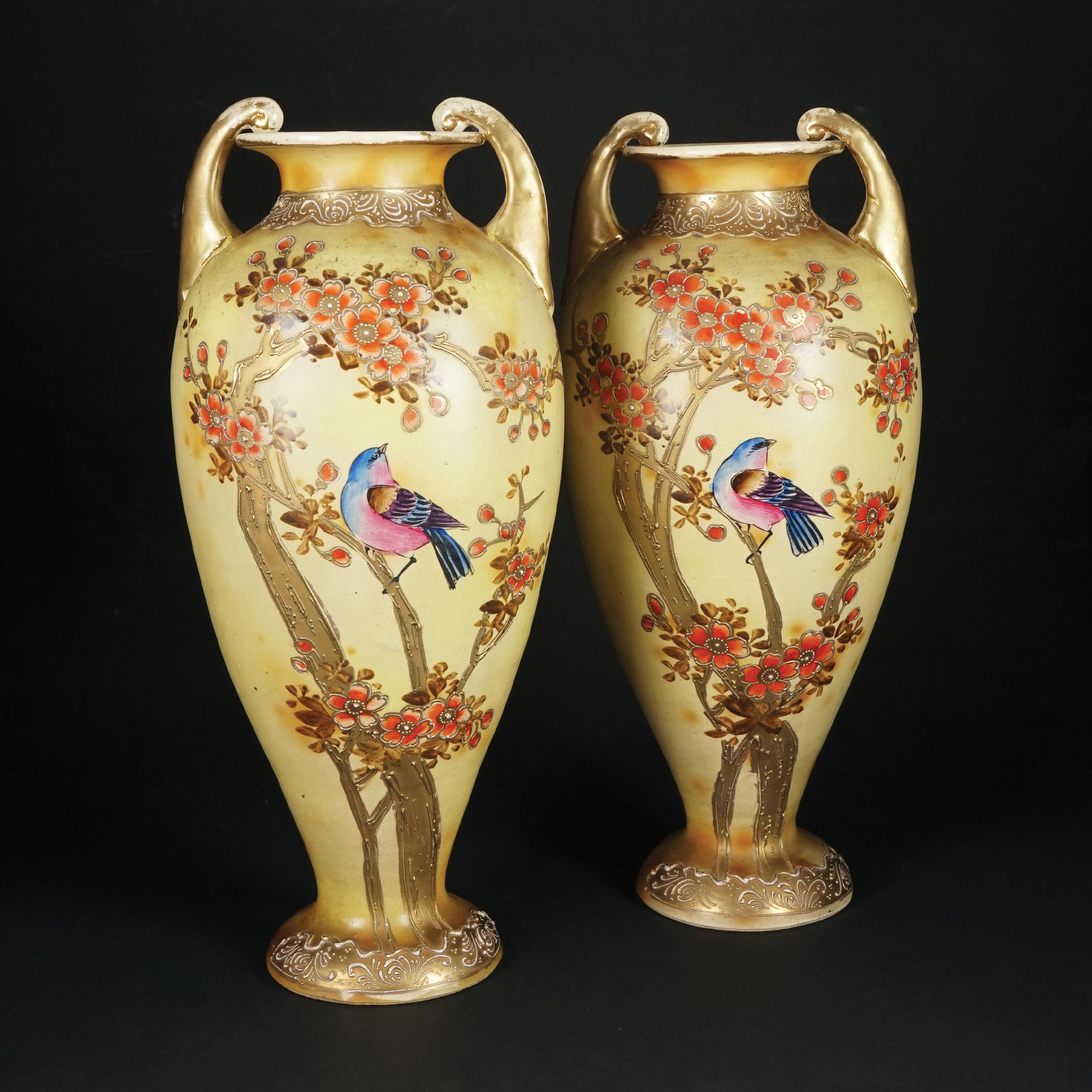 Coppia di vasi in terraglia a fondo avorio con particolari dorati, decorati a raffigurare un volatile su un ramo di pruno; due corte anse stilizzate.