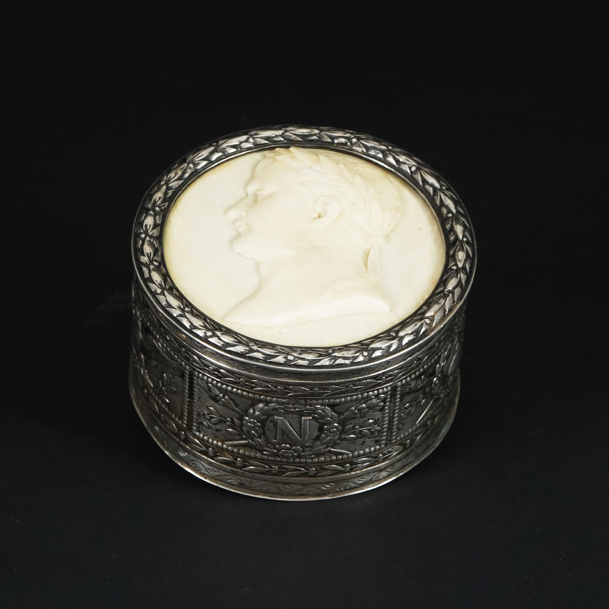 Tabacchiera circolare in argento finemente cesellato; coperchio caratterizzato da un bassorilievo in avorio raffigurante Napoleone colto di profilo.