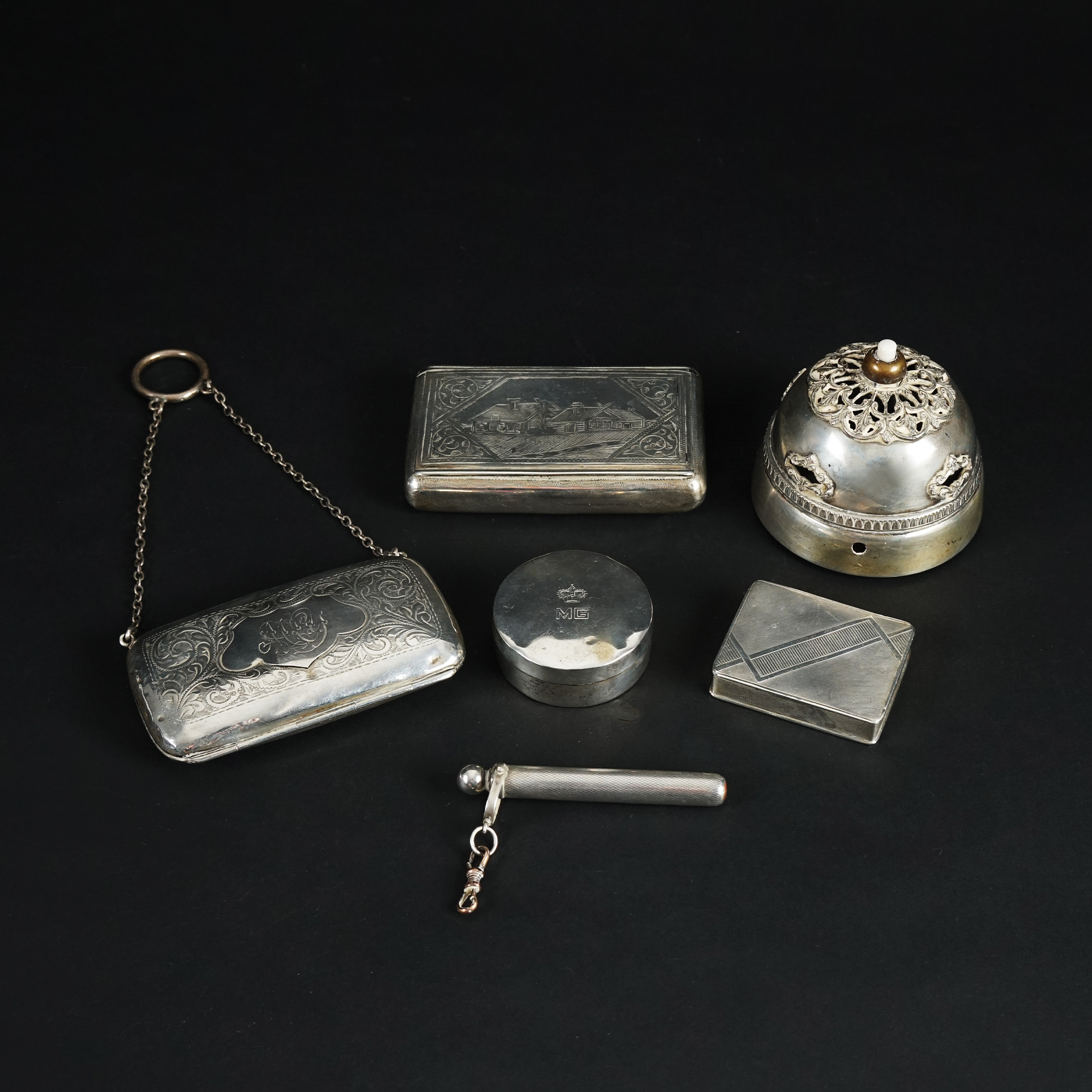 Lotto di sei oggetti in argento di diversa epoca, tipologia e manifattura,...