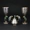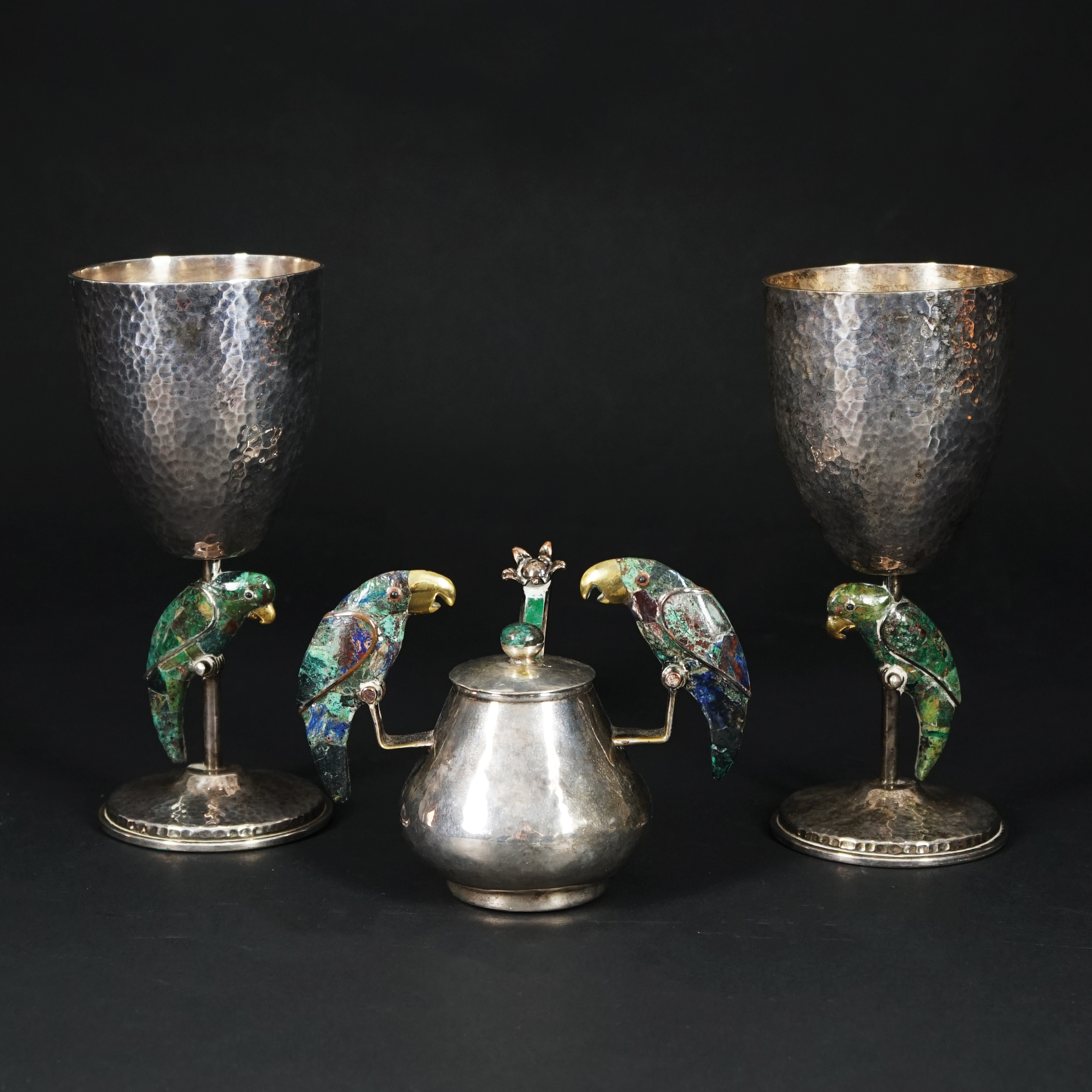 Coppia di bicchieri e una zuccheriera con coperchio e relativo cucchiaino, in metallo argentato a superficie martellata; steli e prese in forma di un pappagallo placcato in pietre dure.