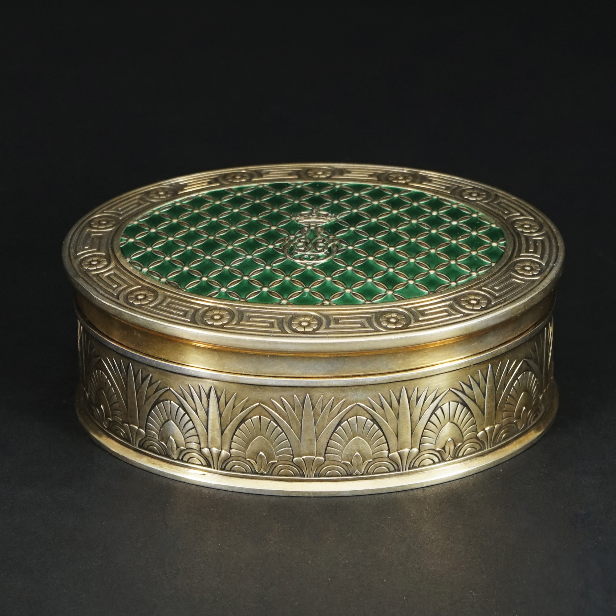 Scatola in argento dorato, di forma ovale; coperchio con cornice a greca che circoscrive una riserva ovale caratterizzata da una sorta di griglia su fondo in smalto verde: al centro le doppie iniziali F intrecciate sormontate da una corona reale a indicare quelle del re Faruq e della regina Farida; parete finemente cesellata a sequenza di palme stilizzate. All'interno dello stesso un'iscrizione a caratteri arabi: Kasr al-Qoubba (Palazzo al-Qoubba), 20 gennaio 1938.