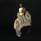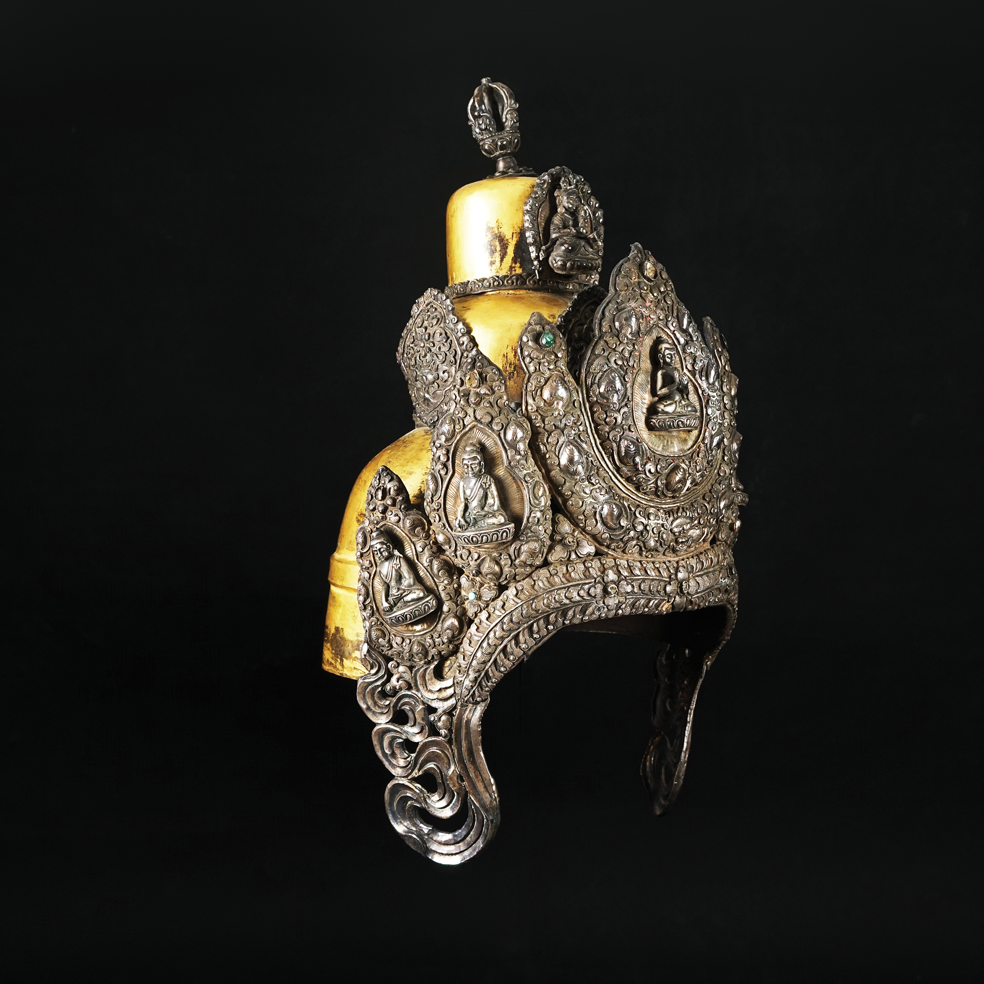 Antico elmo in ottone e argento finemente cesellato e sbalzato a motivi decorativi di gusto orientale: figure di Buddha in posizione fior di loto arricchiscono il fitto decoro.