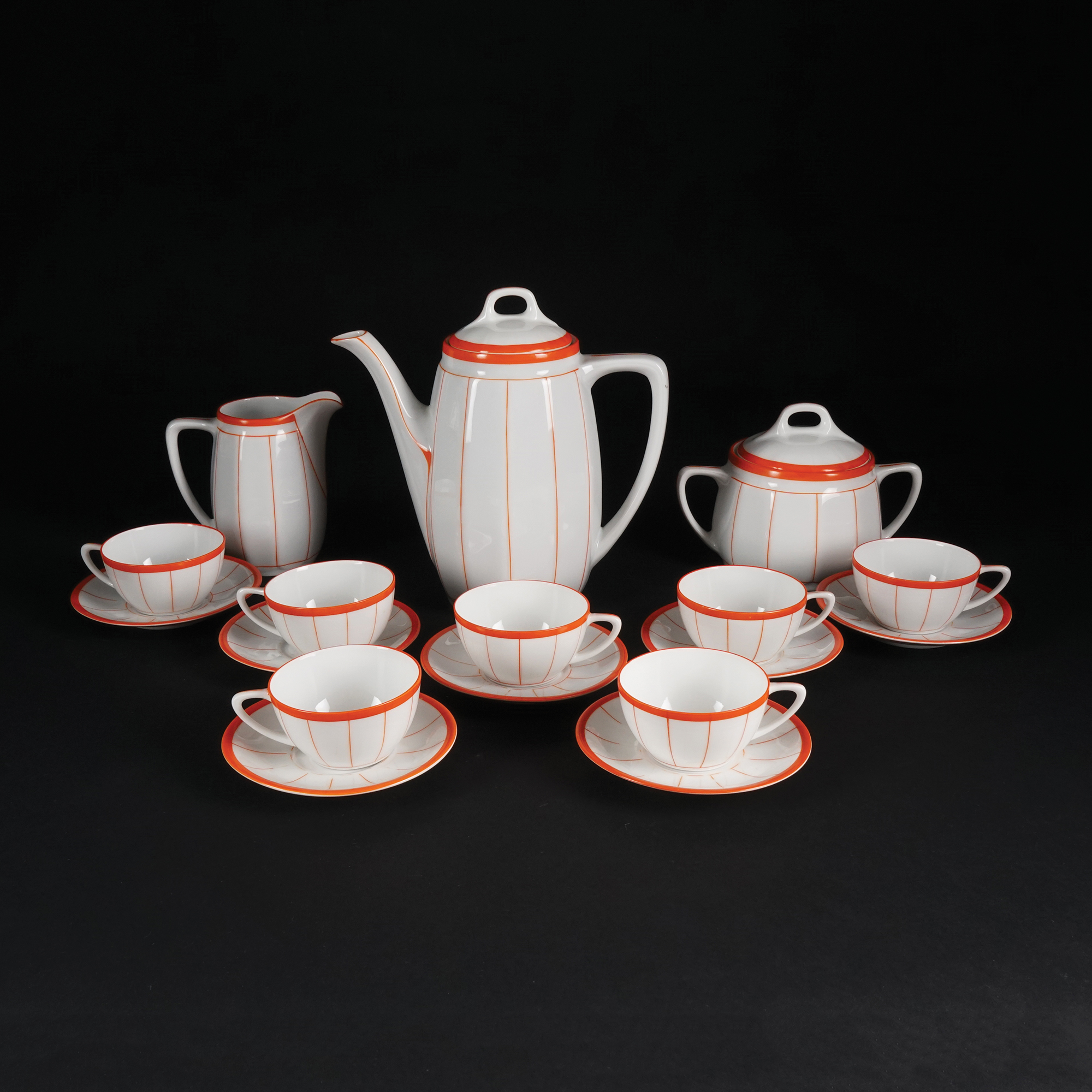 Servizio da caffè in porcellana bianca e arancione composto da una caffettiera, una lattiera, una zuccheriera con coperchio, otto tazze da caffè e sette piatti.