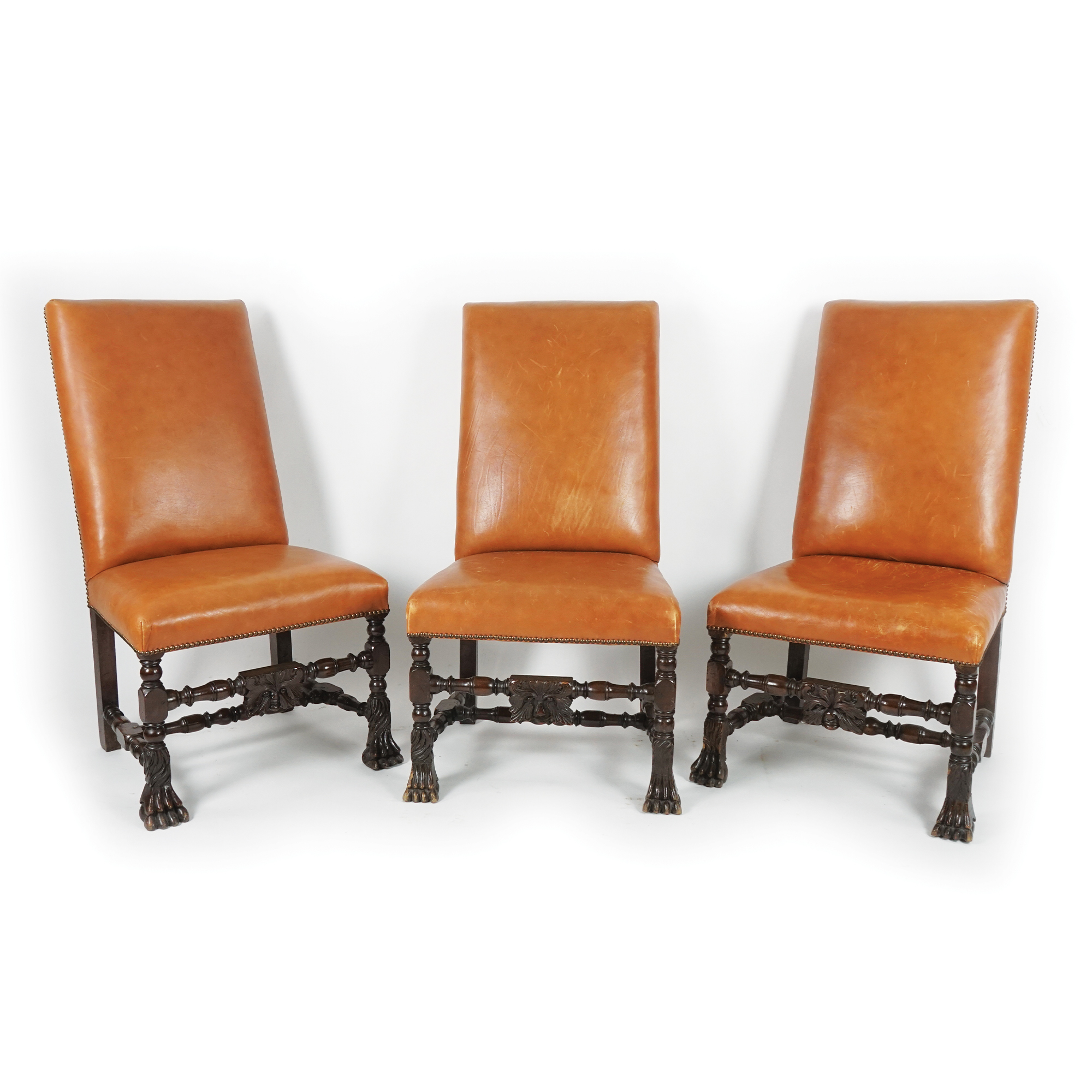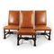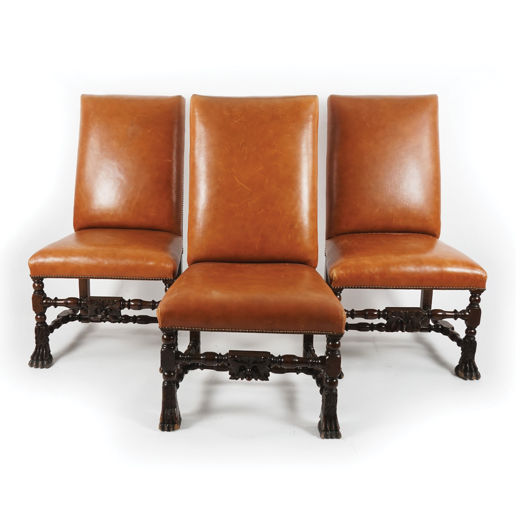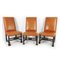 Sei seggioloni in noce con montanti anteriori e traverse di riunione a rocchetto; sedute e alti schienali imbottiti.