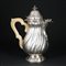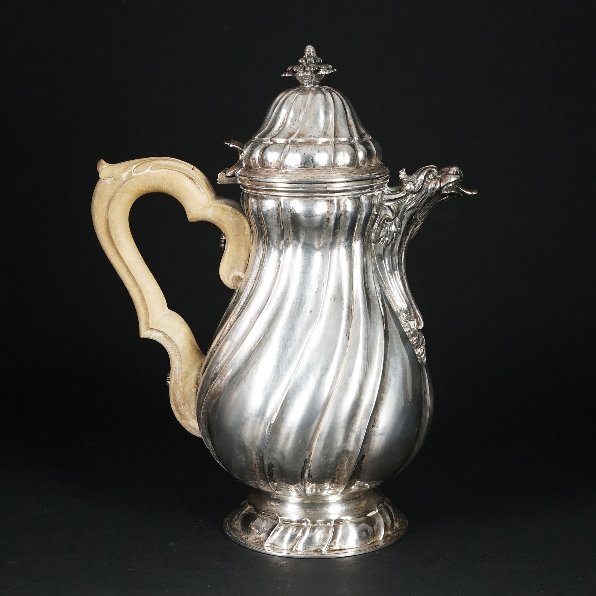 caffettiera piriforme in argento a superficie liscia sbalzato a costolature elicoidali; beccuccio finemente cesellato a raffigurare una testa ferina; coperchio a cupolino incernierato centrato da una presa a bocciolo; piede circolare; ansa lignea a voluta.