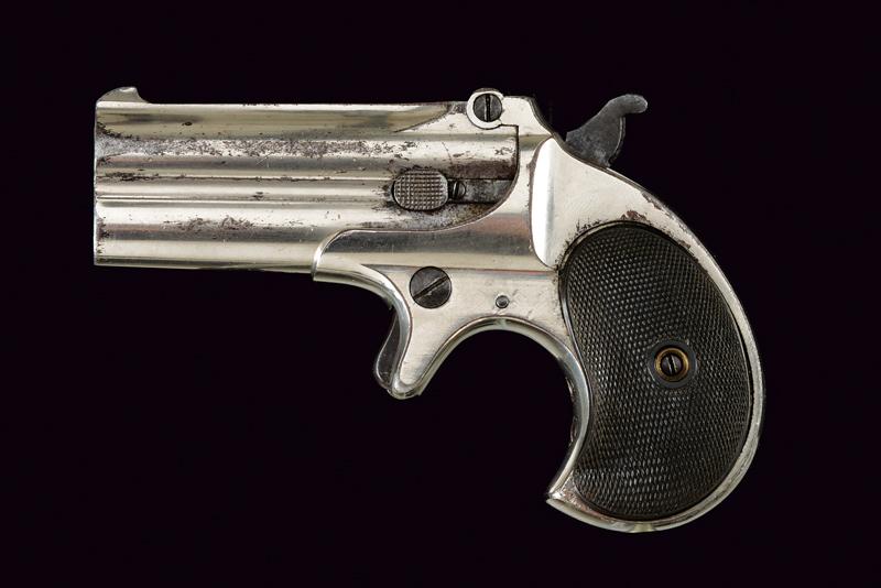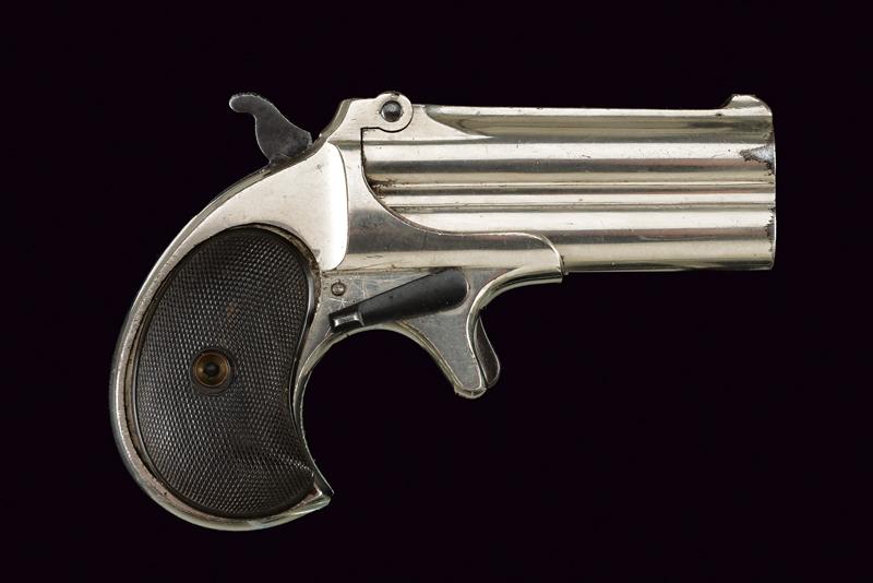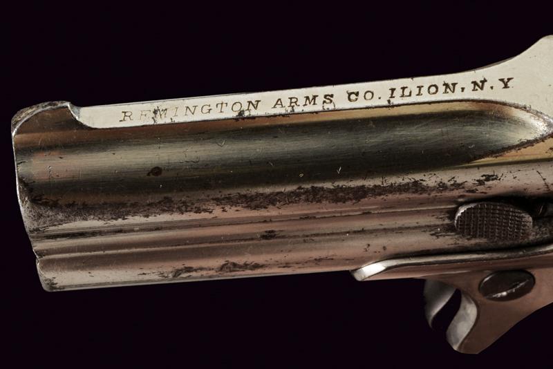 Remington Double Deringer, datazione: 1875-1890 provenienza: USA, Canne tonde rigate, sovrapposte, marcatura della ditta 'REMINGTON ARMS CO. ILION N.Y.', cal. 41 rimfire short. Nichelatura al 85%. Meccanica funzionante, grilletto a sprone. Guancette in gommadura zigrinata. lunghezza 13 cm.
