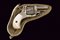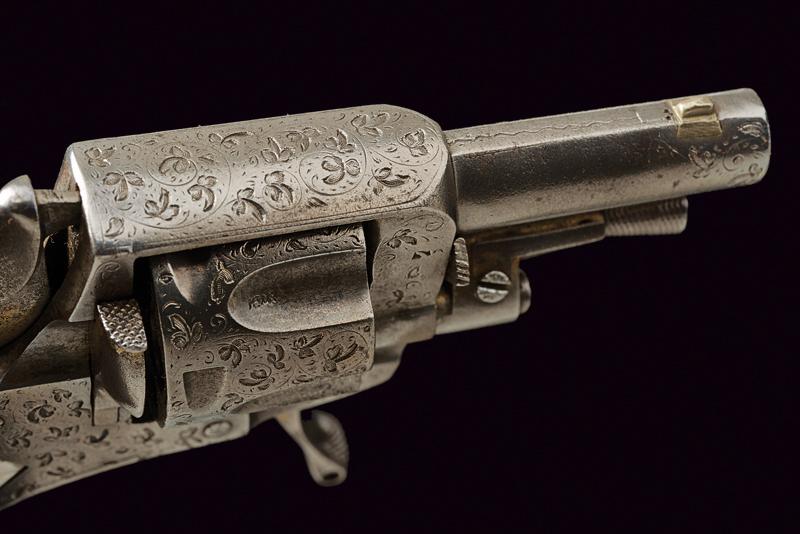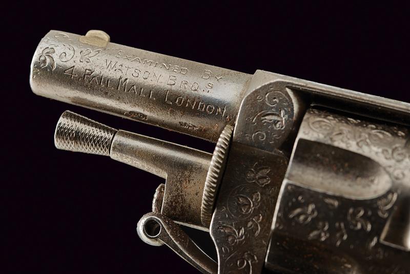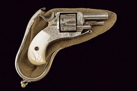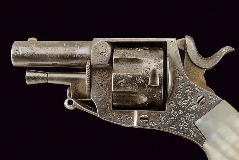 Bellissimo piccolo revolver a percussione anulare da tasca, datazione: 1885 circa provenienza: Londra, Canna rigata con bindella, marcata sul lato sinistro 'Examined by Watson Bro.s 44 Pall Mall London', tamburo scanalato a sei colpi cal. 22SH, inciso come anche il castello. Sportellino di caricamento, grilletto pieghevole. Guancette in madreperla (qualche chip). Nel suo astuccio di pelle originale. lunghezza 9.8 cm.