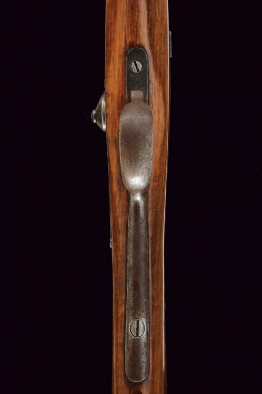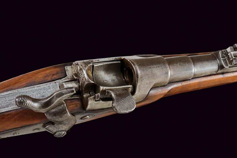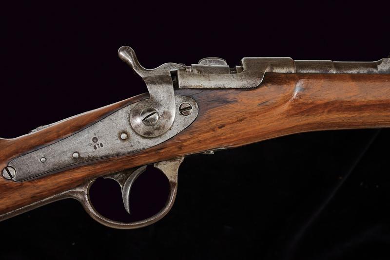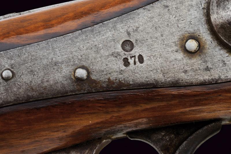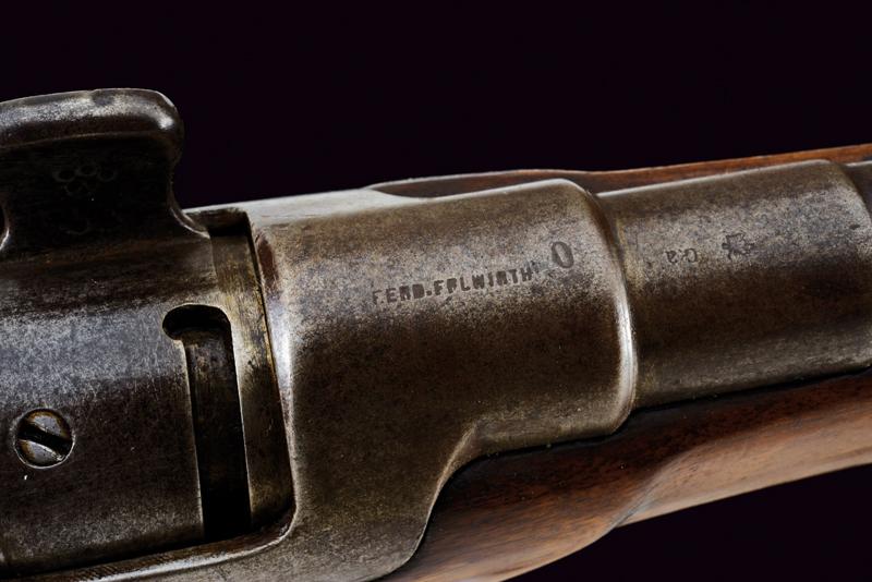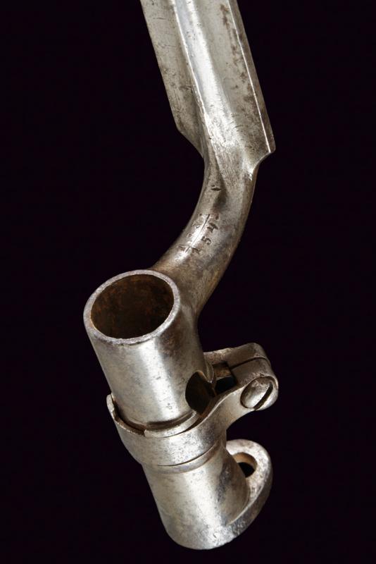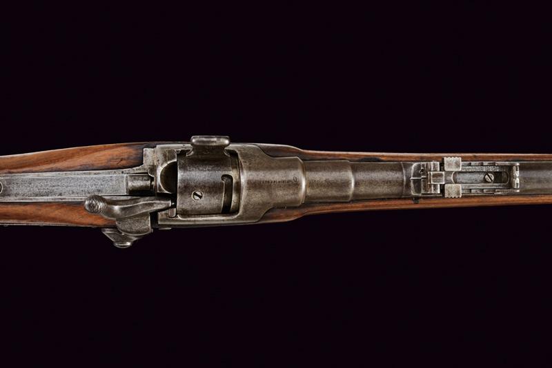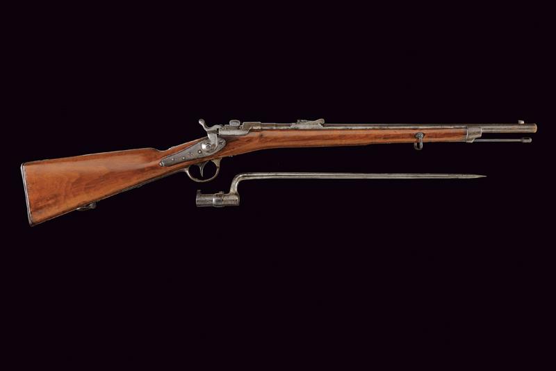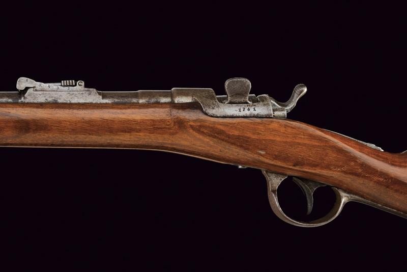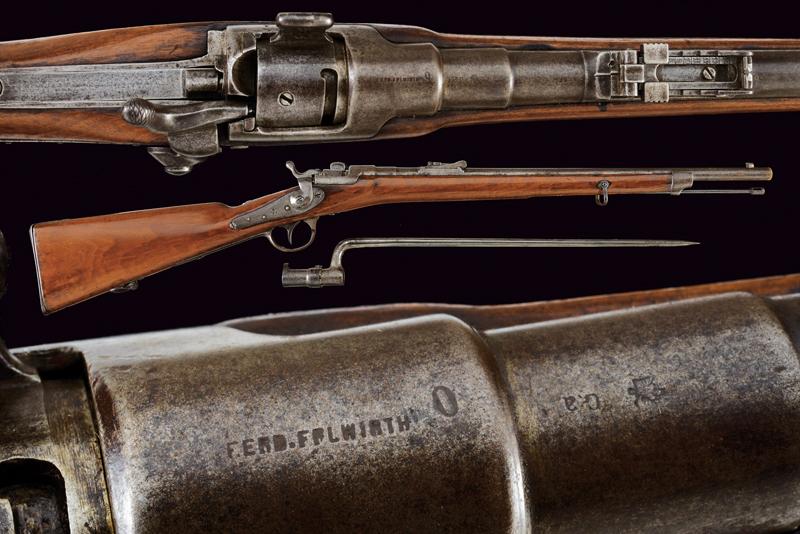 Carabina Werndl Mod. 1867/77 con baionetta, datazione: Terzo quarto del XIX Secolo provenienza: Austria, Canna tonda rigata (anima pulita, rigatura ben visibile), dotata di mirino, alzo abbattibile e regolabile, recante alla base resti di marcature 'F.ERB. FRUIWRTH', punzone ad aquila bicipite e 'C.a.'. Cal. 10,8 mm. in volata. Otturatore a blocco rotante funzionante. Batteria con meccanica funzionante, cartella datata '870' e con marchio imperiale ad aquila. Cassa intera in legno. Fornimenti in ferro con qualche intaccatura. Baionetta a ghiera (lungh. 56,5 cm.) con scanalatura a spirale, di diametro leggermente largo rispetto alla canna. Allegate note sui punzoni raccolte dal proprietario. lunghezza 99,5 cm.