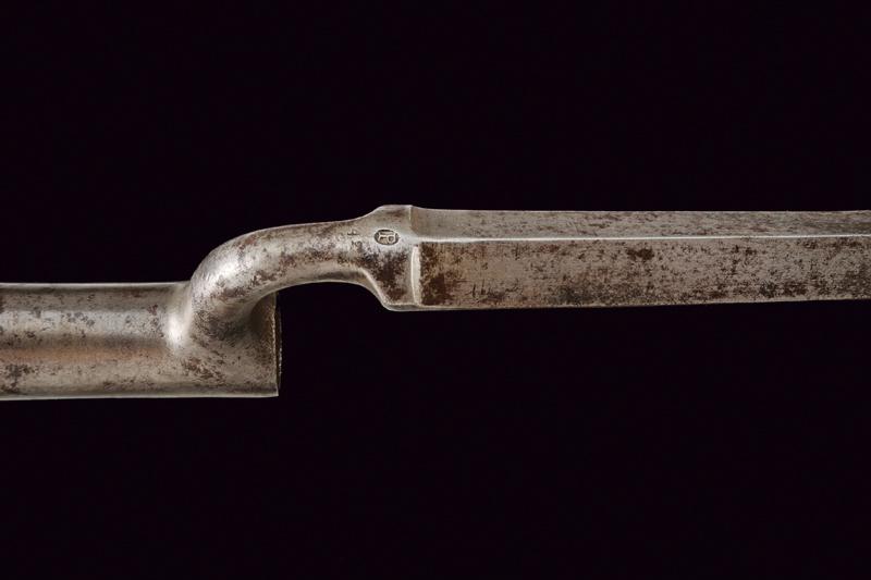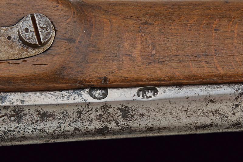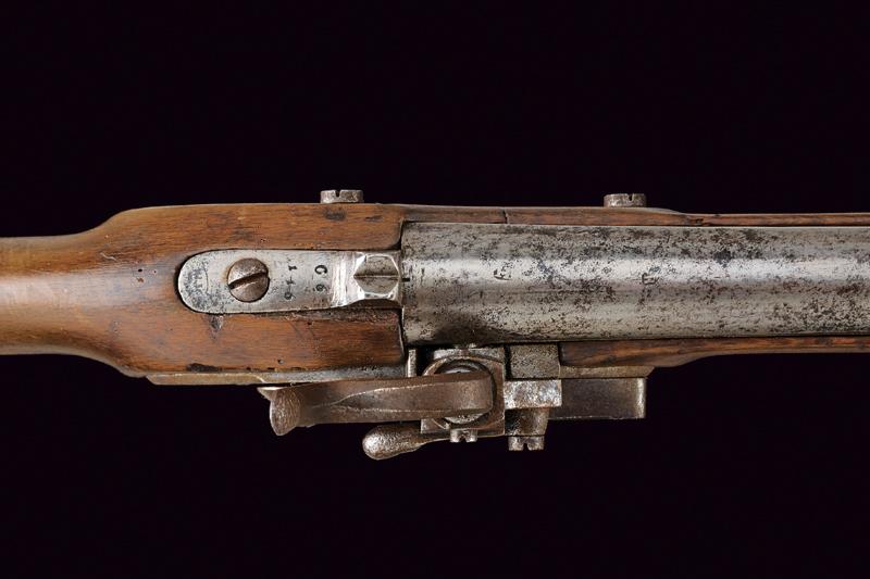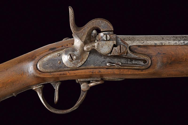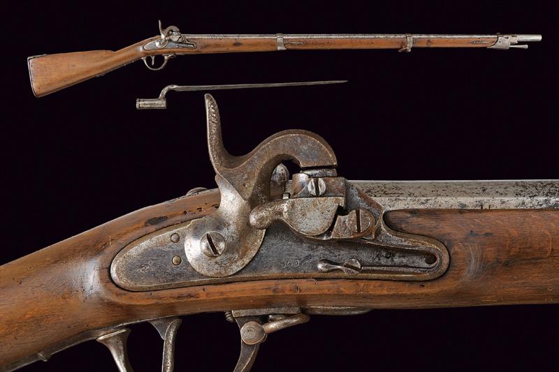 Fucile Augustin Mod. 1842 da fanteria con baionetta, datazione: Secondo quarto del XIX Secolo provenienza: Austria, Canna liscia tonda, con resti di punzoni, numeri e marchi alla base, cal. 17,8 mm. Intaccature all'interno. Codolo con alzo fisso e resti di numeri. Batteria con resti di punzone imperiale e data '843'. Meccanica funzionante. Cassa intera in legno, con segni d'uso e del tempo, fori di tarlo restaurati. Fornimenti in ferro recanti resti di punzoni. Intaccature. Bocchino con mirino. Bacchetta in ferro. Baionetta a manicotto (lungh. 58,5 cm.) Calciolo con resti di marcatura di reparto 'IR 26 / ...G... / 116'. Con note del proprietario. lunghezza 146,5 cm.