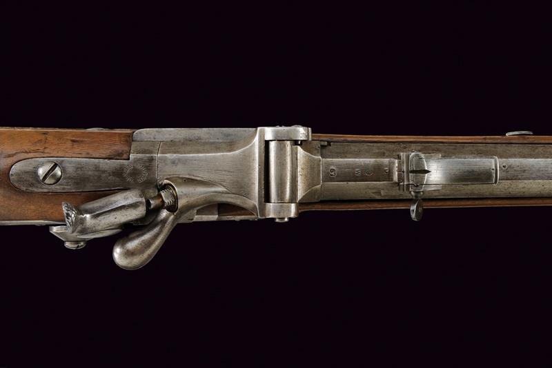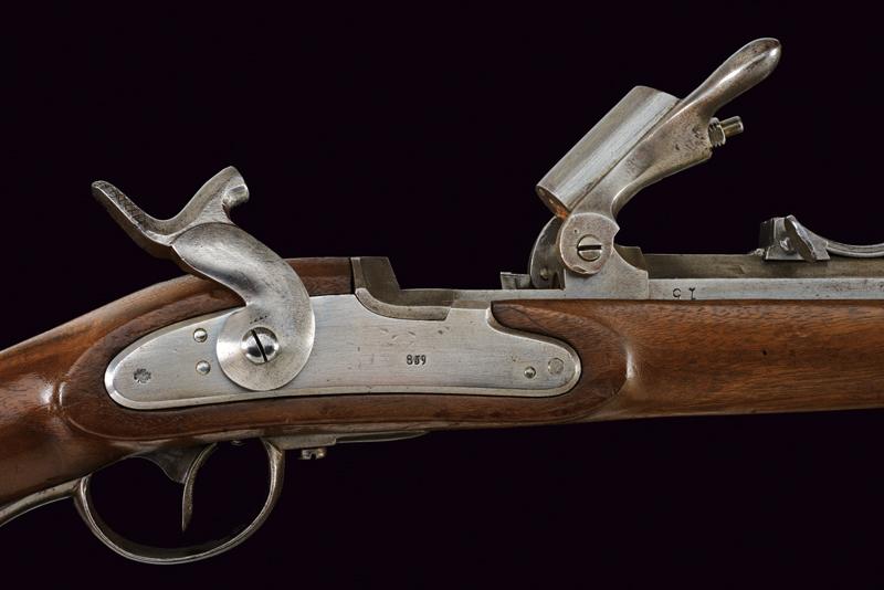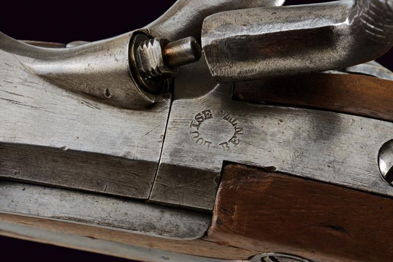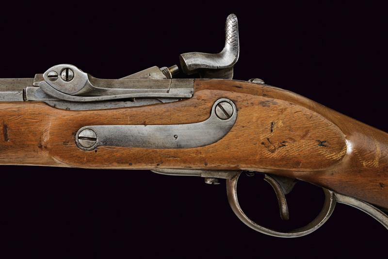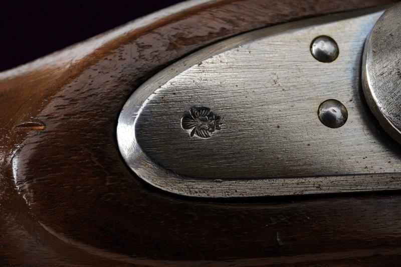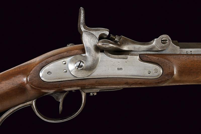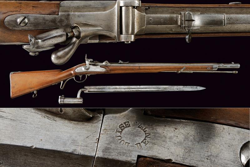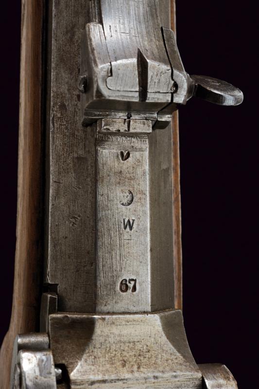Jägerstutzen mod. 1854/67 sistema Wanzel con baionetta, datazione: Terzo quarto del XIX Secolo provenienza: Austria, Canna rigata (anima pulita, rigatura visibile), ottagonale, con volata tonda, marcata 'W', '67', con resti di altri punzoni e con il timbro ad aquila, alzo regolabile, mirino e dente d'innesto per la baionetta, cal. 13.9 mm. Otturatore ribaltabile, codetta con resti di marcatura 'LOUISE BENTL.' Batteria a molla in avanti datata '859', aquila ben visibile. Meccanica funzionante. Cassa intera in legno con resti di timbri visibili alla pala, qualche foro di tarlo. Fornimenti in ferro. Calciolo con marcatura 'IL. V.D. / 7573'. Con baionetta a ghiera (lungh. 70 cm.) Insieme con note del proprietario. lunghezza 109,6 cm.