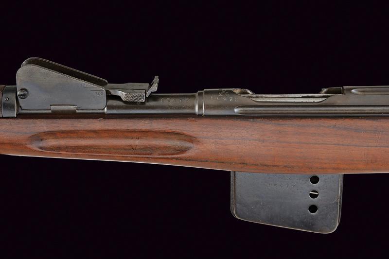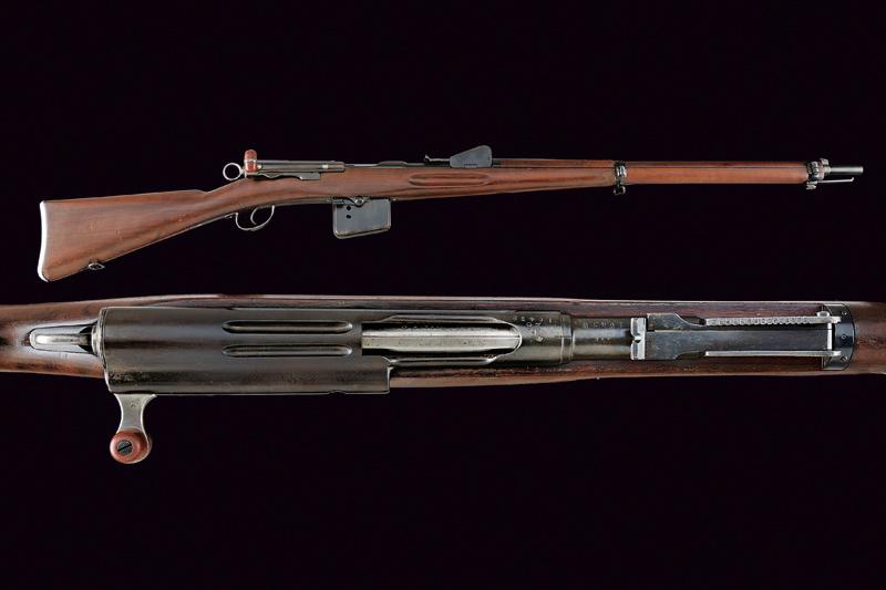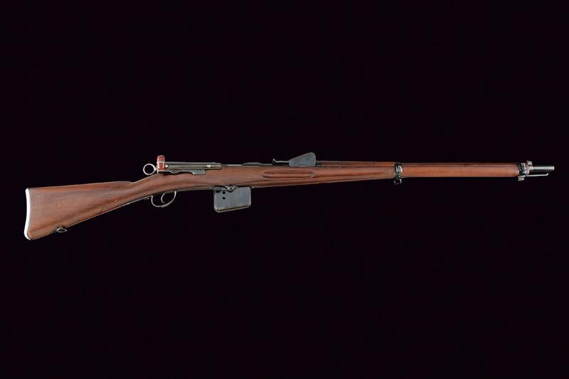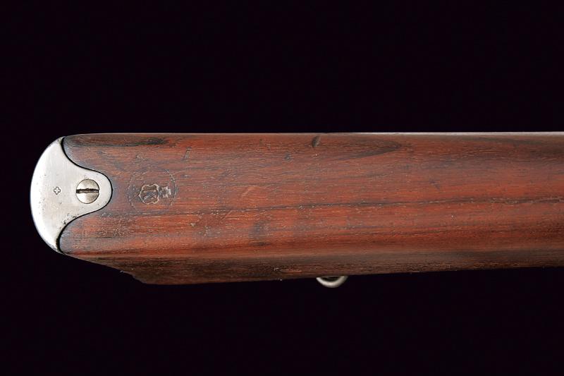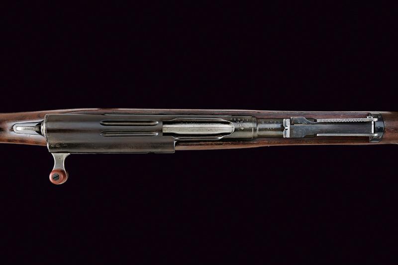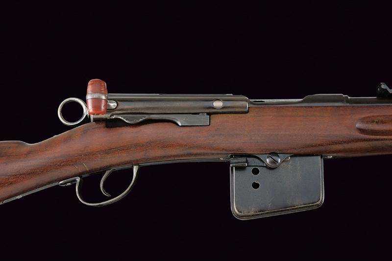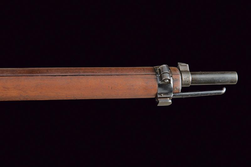 Fucile a retrocarica Rubin Schmidt Mod. 1889, datazione: 1875-1890 provenienza: Svizzera, Canna tonda rigata (anima pulita, rigatura visibile), munita di mirino ed alzo regolabile, punzonata con croci elvetiche, 'P26', cal. 7,5 mm. Otturatore scorrevole con leva di caricamento dotata di manopola in legno. Meccanica funzionante. Telaio con scanalature; cassa intera in legno con due brevi scanalature sotto all'alzo e timbro elvetico sulla pala; fornimenti in ferro, caricatore estraibile. Calciolo punzonato con croce elvetica, a parte questo componente tutti gli altri bruniti. lunghezza 130 cm.