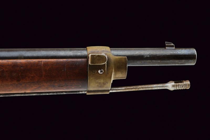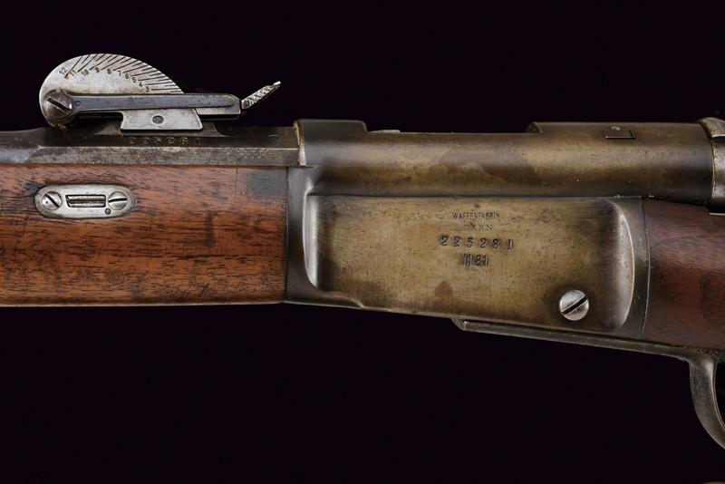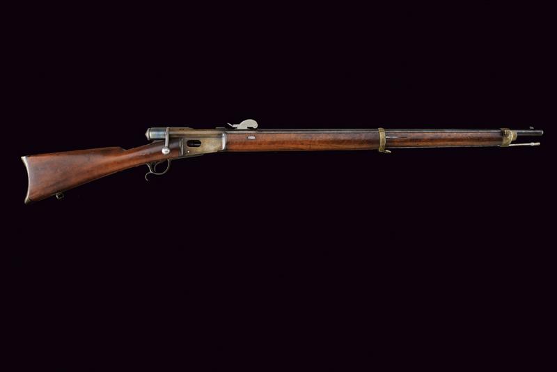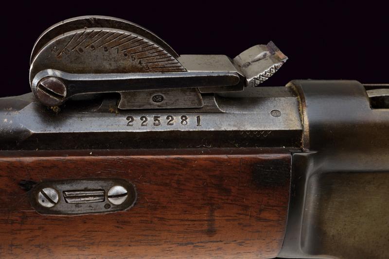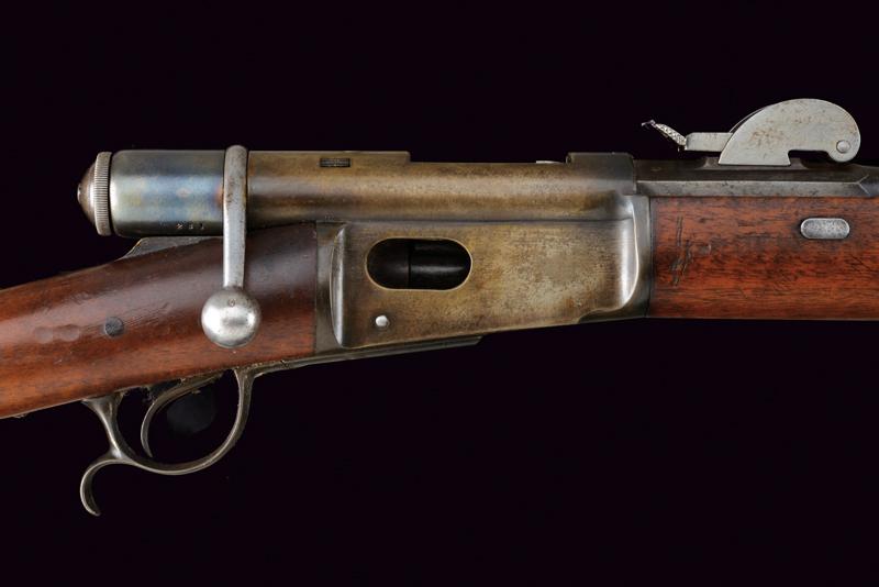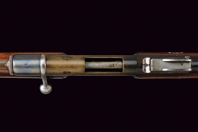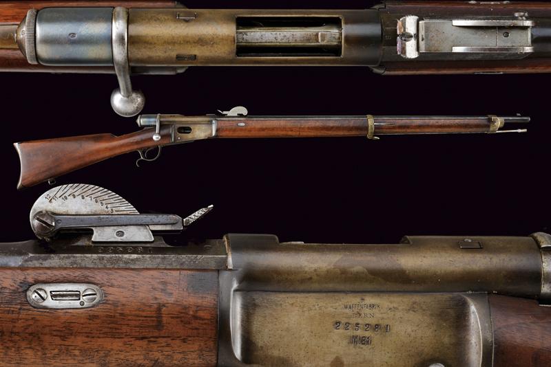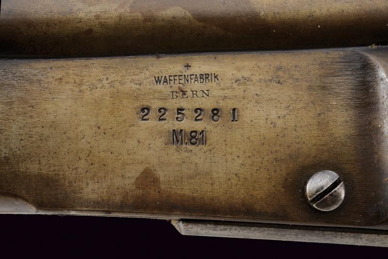 Fucile Vetterli Mod. 1881, datazione: 1875-1890 provenienza: Svizzera, Canna tonda rigata (rigatura visibile), dotata di mirino, alzo regolabile, con culatta ottagonale punzonata "R", "V" e "M" tutte sormontate da croce elvetica, cal. 8 mm. Otturatore girevole-scorrevole funzionante. Percussione centrale. Castello marcato "WAFFENFABRIK BERN" matr. "225xxx" e con dicitura "M. 81". Calcio ed astina lisci in legno. Fornimenti e bacchetta in ferro. Canna con resti di brunitura antica. Ponticello con poggiadito. lunghezza 131,7 cm.
