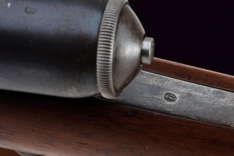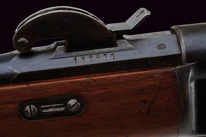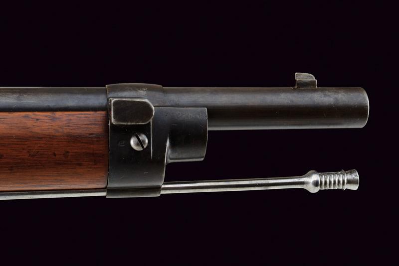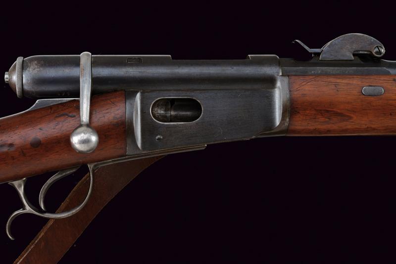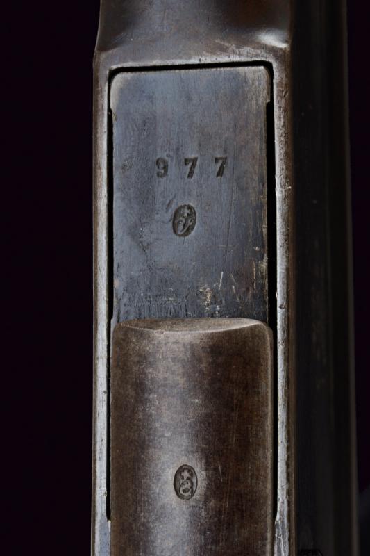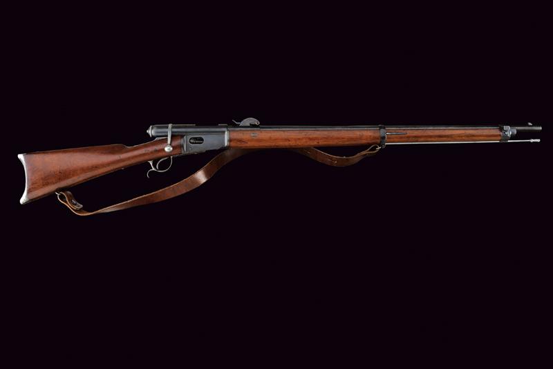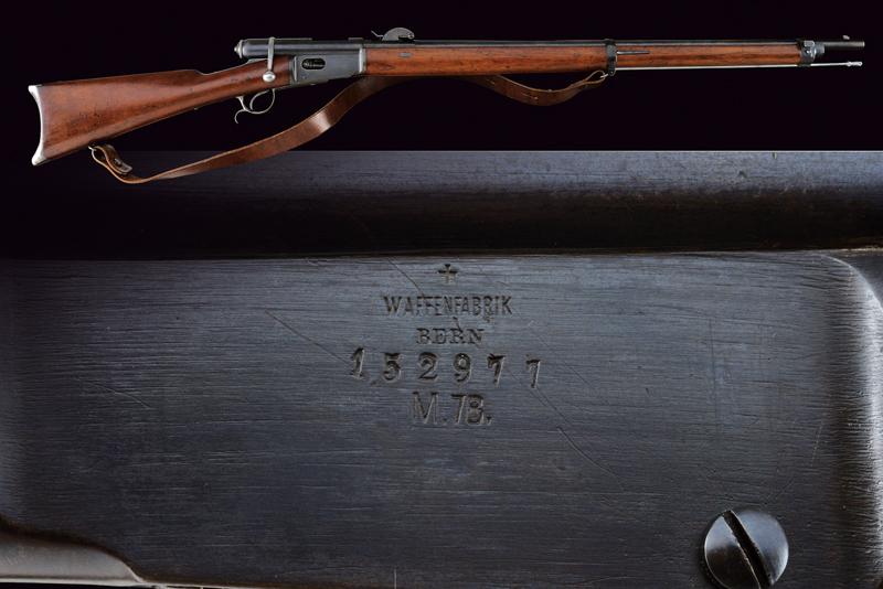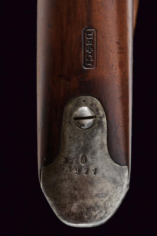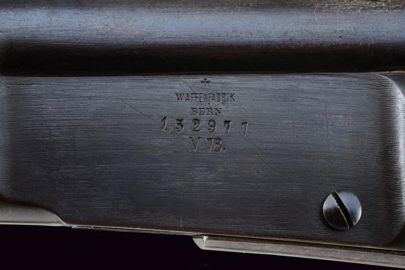Fucile Vetterli Mod. 1878, datazione: 1875-1890 provenienza: Svizzera, Canna tonda rigata (anima pulita, un po' di pitting accanto alla volata, rigatura ben visibile), dotata di mirino, alzo regolabile, con culatta ottagonale punzonata 'R' e 'S' sotto croce elvetica, con una grande 'M', e con matricola '152xxx'cal. 10,4 mm. Otturatore girevole-scorrevole funzionante. Castello con marcatura 'WAFFENFABRIK BERN' sotto croce, marcatura del modello e matricola coeva. Calcio ed astina lisci in legno, la pala con timbro 'D8+CI' al dorso. Calciolo e ponticello con segni d'uso. Fornimenti in ferro. Ponticello con poggiadito. lunghezza 132 cm.