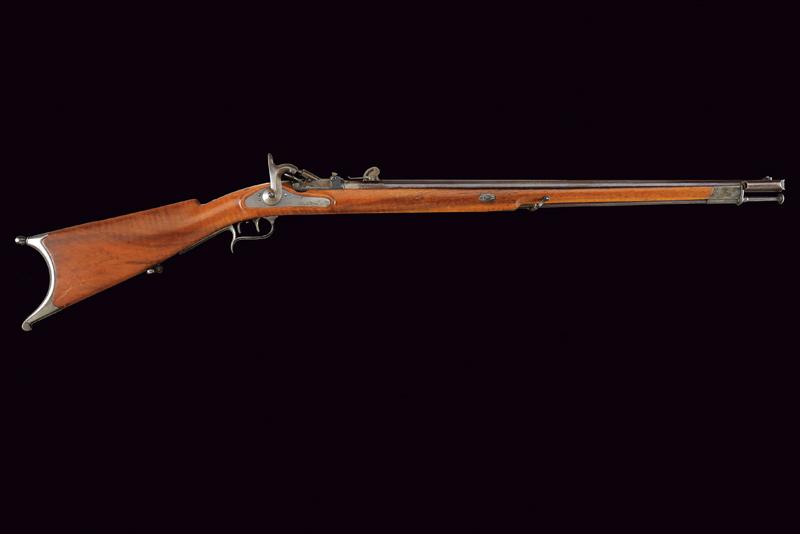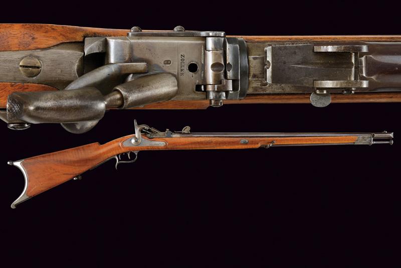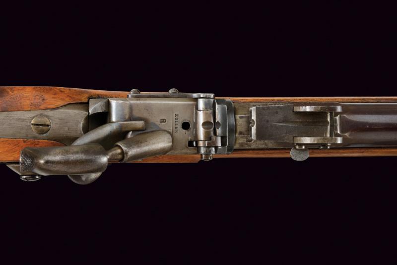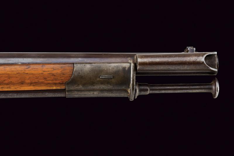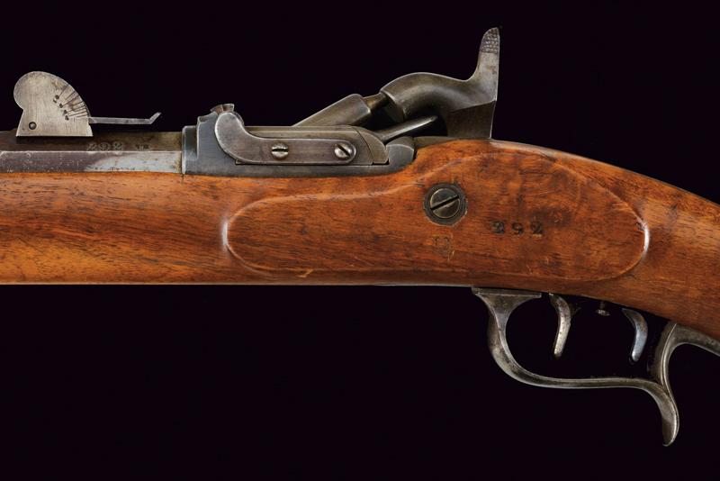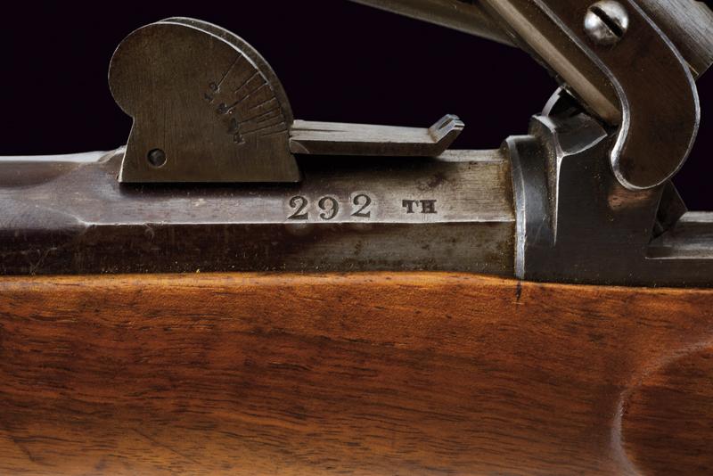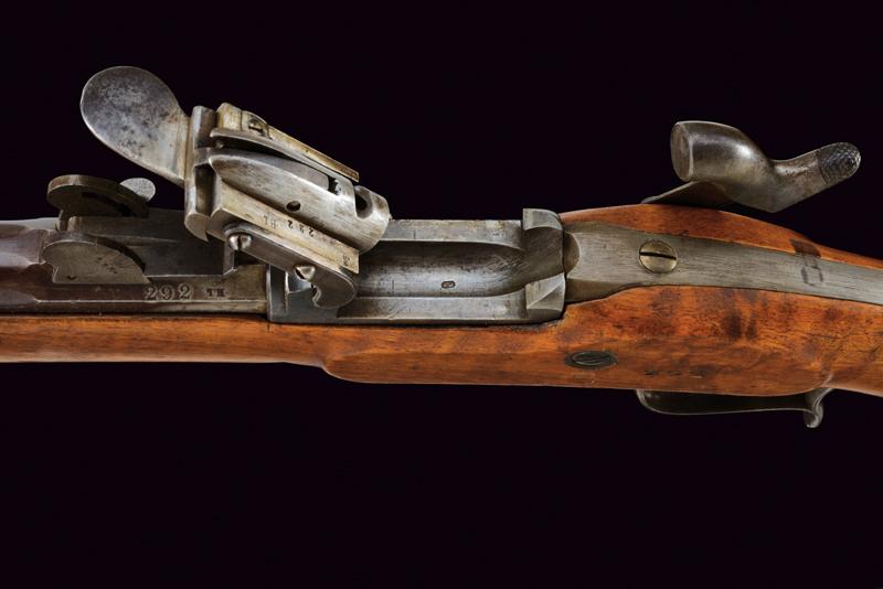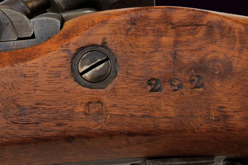 Fucile Milbank-Amsler a retrocarica Mod. 1851/63, datazione: Terzo quarto del XIX Secolo provenienza: Svizzera, Canna tonda rigata dotata di mirino, alzo regolabile, culatta ottagonale con punzone 'TH', un'alto punzone e '292', cal. 10.8 mm. Otturatore ribaltabile con punzone 'L' sotto croce elvetica e 'ZOLLER'. Batteria a molla in avanti con punzone 'BF' sotto corona. Meccanica funzionante. Cassa lunga in legno. Fornimenti in ferro. Bacchetta in ferro. Stecher ben funzionante. lunghezza 126 cm.