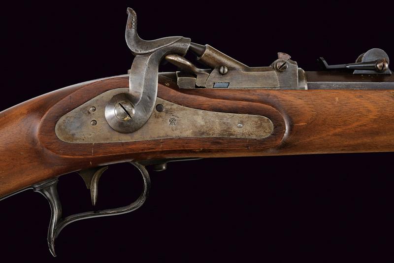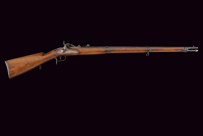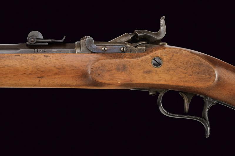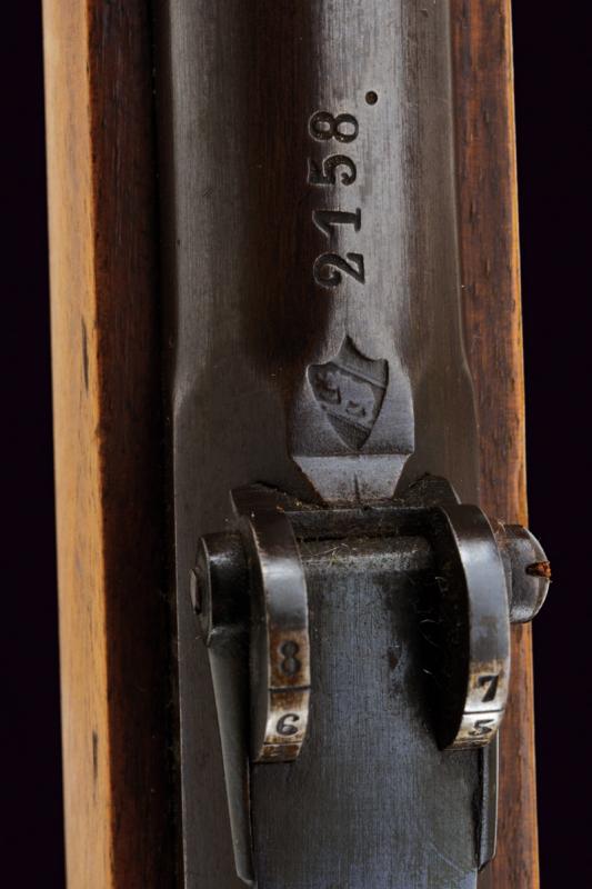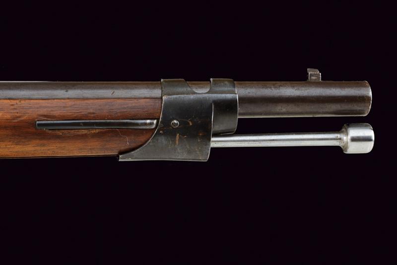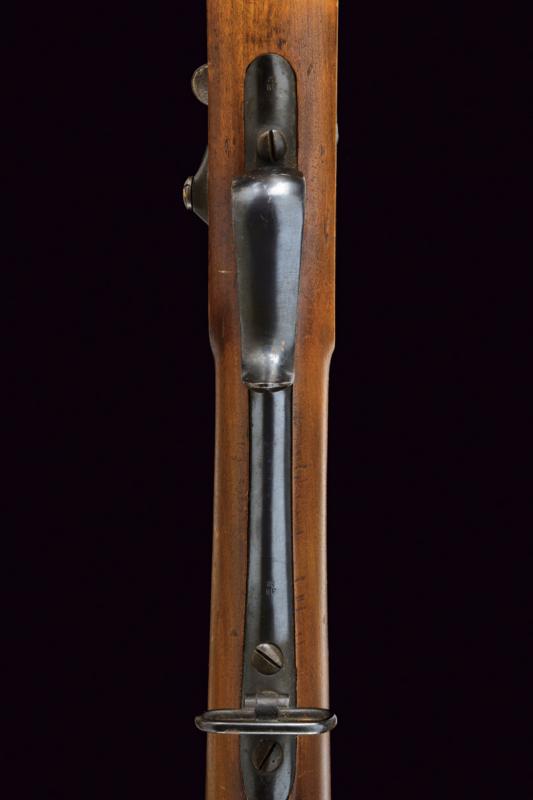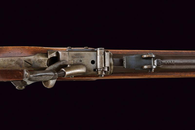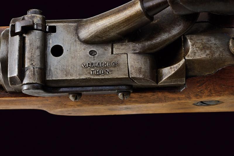 Fucile Milbank-Amsler a retrocarica Mod. 1863/67, datazione: Terzo quarto del XIX Secolo provenienza: Svizzera, Canna tonda rigata con mirino, alzo regolabile, culatta ottagonale con punzoni e matricola '1343 - 2158' , cal. 11 mm. Otturatore ribaltabile marcato 'v. ERLACH & Cie THUN' e 'V' sotto corona. Batteria a molla in avanti con marca. Cassa intera in legno. Fornimenti in ferro con punzoni (BF); brunitura rinfrescata. Bachetta in ferro. lunghezza 133 cm.
