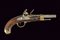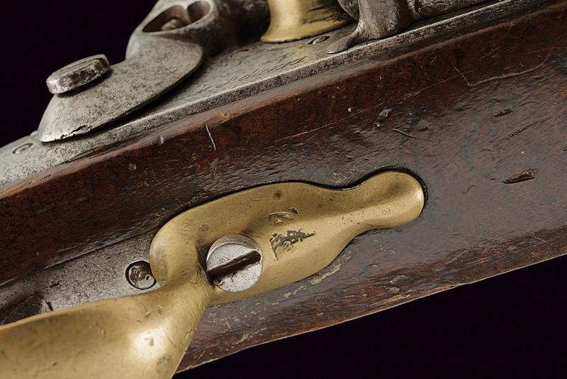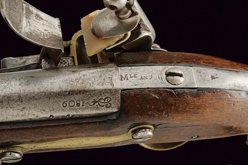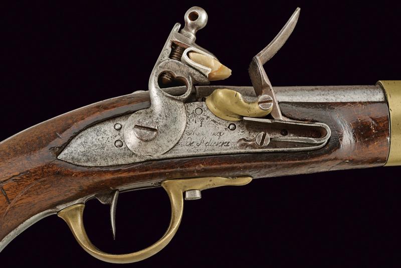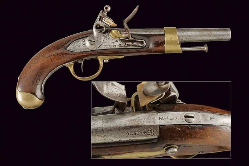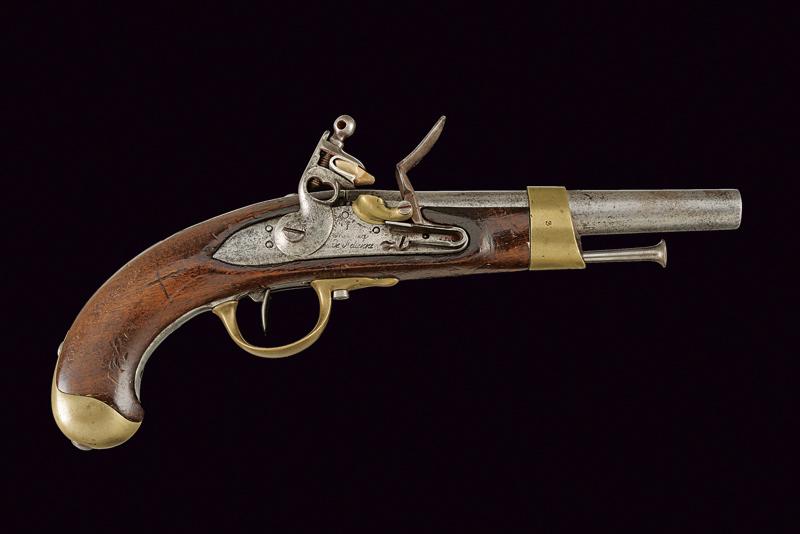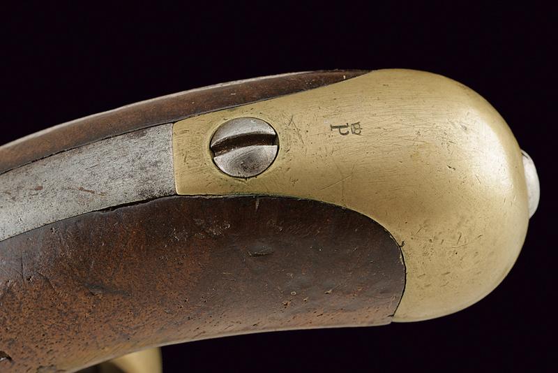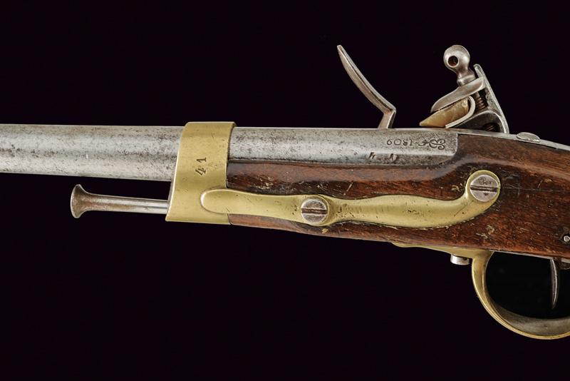 Pistola a pietra focaia An XIII, datazione: 1809 provenienza: Francia, Canna liscia, tonda, con base ottagonale, datata 'I809' e punzonata, cal. 17,5 mm; codolo con marcatura 'M. AN 9'. Batteria con resti di marcatura 'M. Imp. de St. Etienne' e con tracce di un punzone. Meccanica funzionante. Cassa in legno con resti di numerazioni sul fianco sinistro e in basso. Fornimenti in ottone. Dorso in ferro con marchio coronato, coccia con 'P' coronata, ponticello con tracce di timbri, bocchino numerato come la cassa e sempre con 'P' coronata. Bacchetta in ferro. lunghezza 35 cm.
