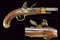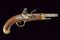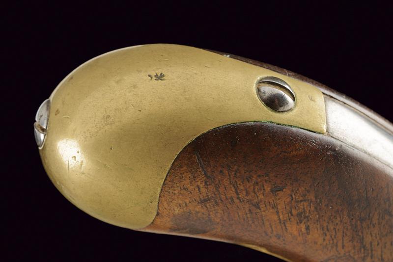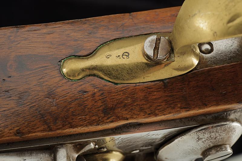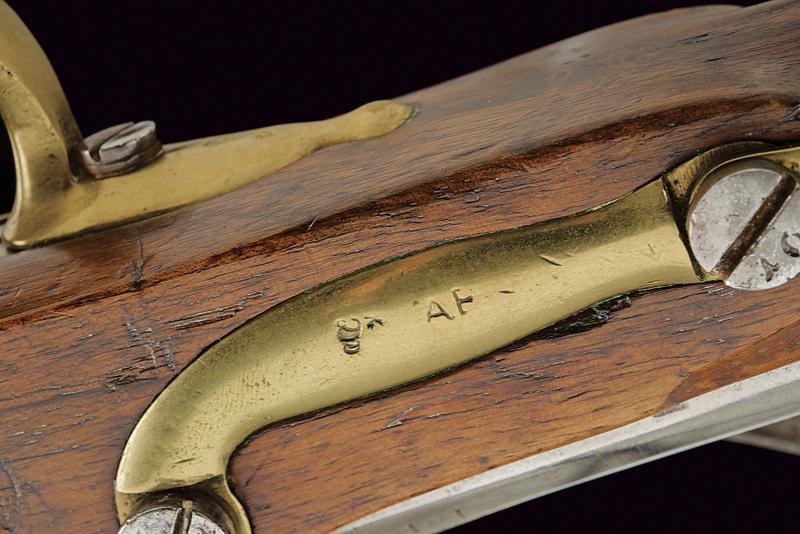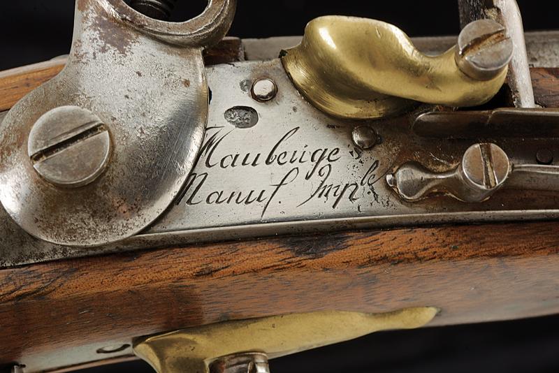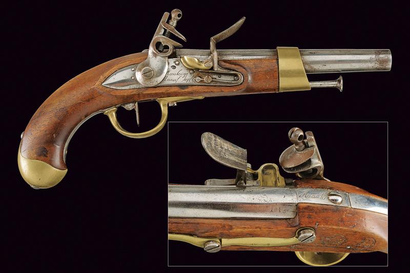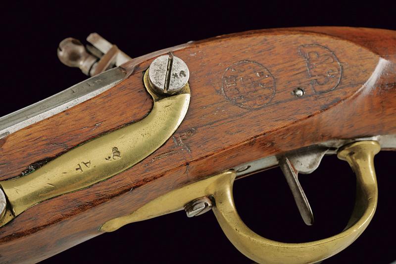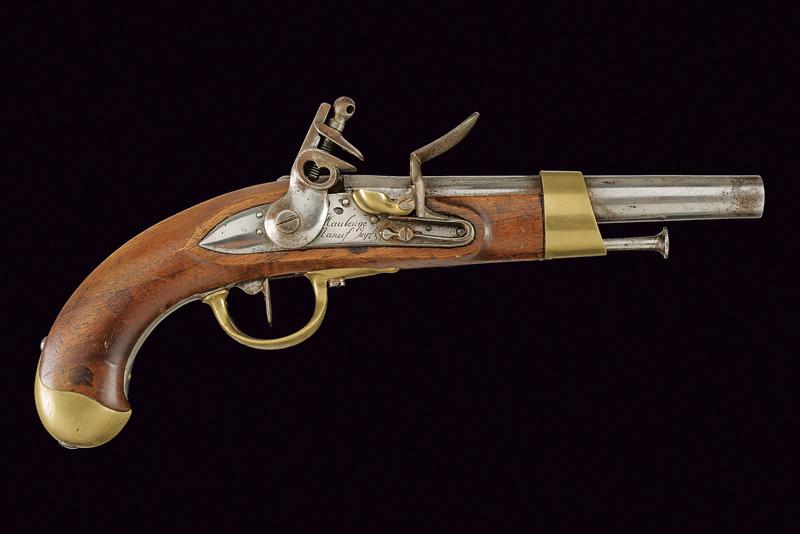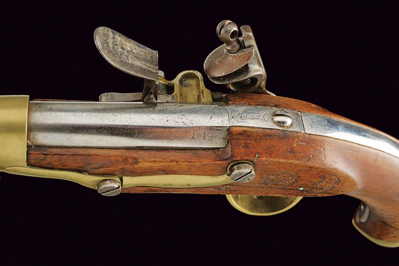 Pistola a pietra focaia An XIII, datazione: 1813 provenienza: Francia, Canna liscia, tonda, con base ottagonale, datata '1813', cal. 17,5 mm; codolo con marcatura 'M. an 13'. Batteria marcara 'Maubeuge Manuf. Imp.le' e con resti di un punzone. Meccanica funzionante. Cassa in legno con timbri su entrambi i lati. Fornimenti in ottone con resti di punzoni. Bacchetta in ferro. lunghezza 35 cm.