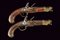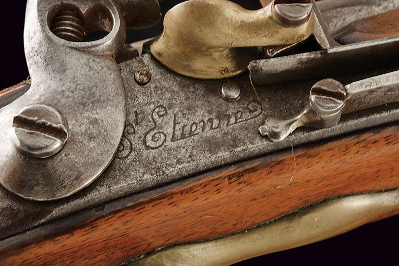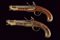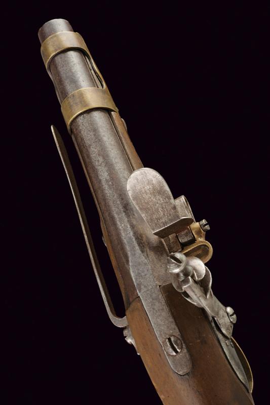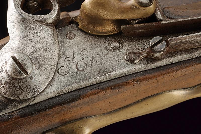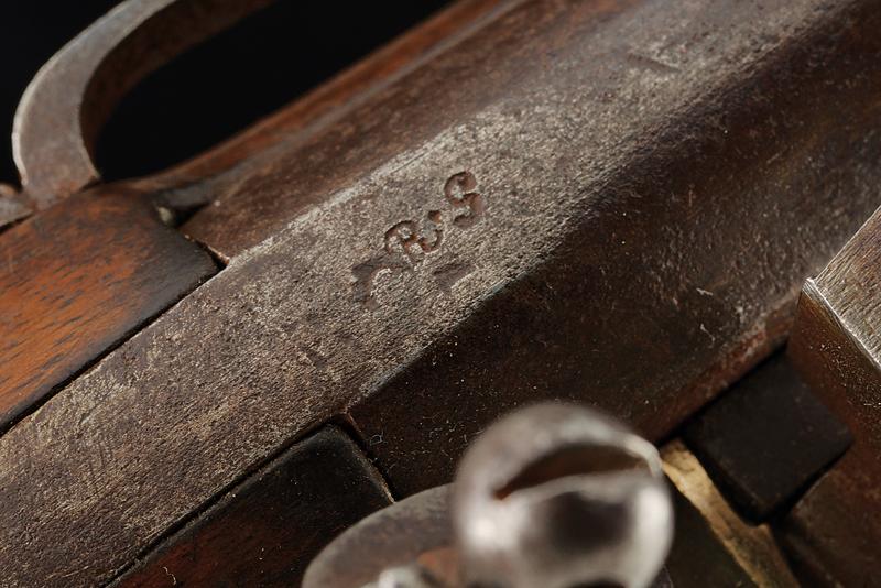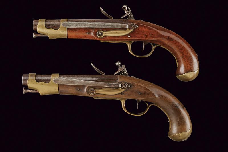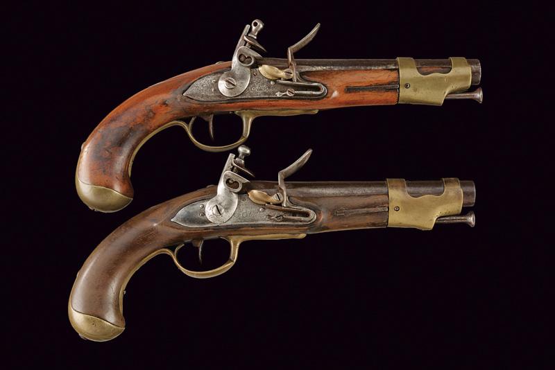 Due pistole a pietra focaia da ufficiale, datazione: fine del XVIII Sec. provenienza: Francia, Canne tonde lisce, con culatte ottagonali, uno con resti di marchio 'R.S', cal. 16,7 mm. Batterie con cartella recante resti della marcatura di St. Etienne. Scodellini in ottone. meccaniche funzionanti. Cassa intere in legno. Fornimenti in ottone. Bacchette in ferro. Ganci da cintura sempre in ferro. lunghezza 29,5 cm.