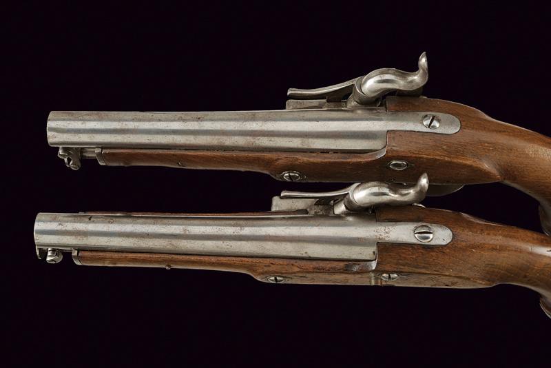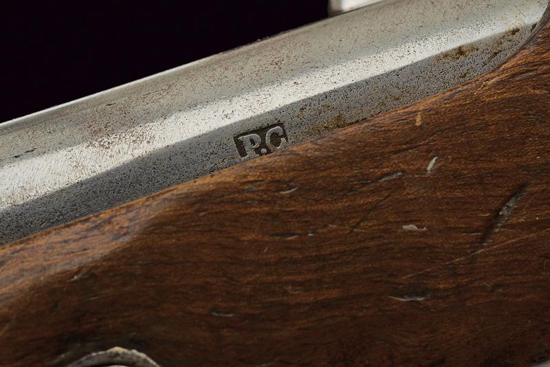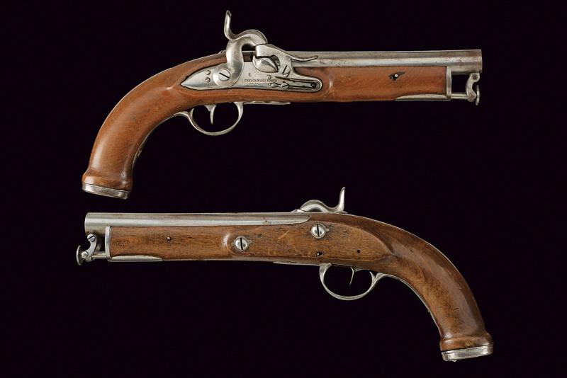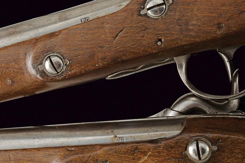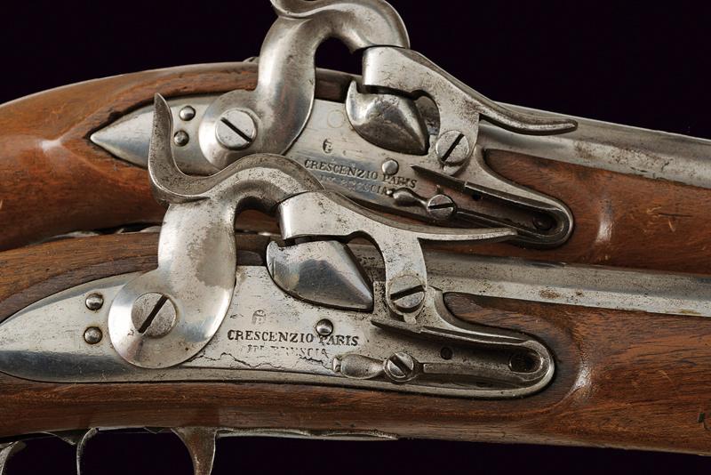 Paio di pistole a luminello di Crescenzio Paris, datazione: Metà del XIX Secolo provenienza: Brescia, Canne tonde lisce, marcate sul lato 'PC', cal. 18 mm; batterie a luminello a molla in avanti firmate 'CRESCENZIO PARIS IN BRESCIA' e con punzone 'P' sotto corona (restauro su una batteria). Sicura. Cassa intera in legno con fornimenti e bacchetta a snodo in ferro. lunghezza 37 cm.