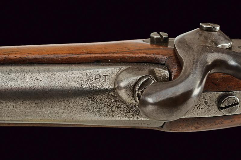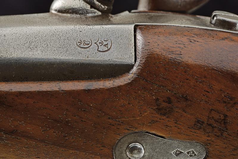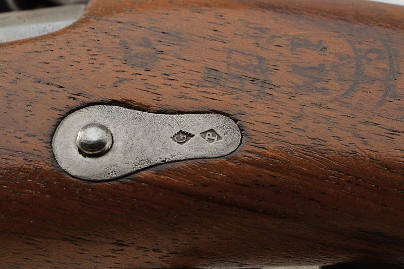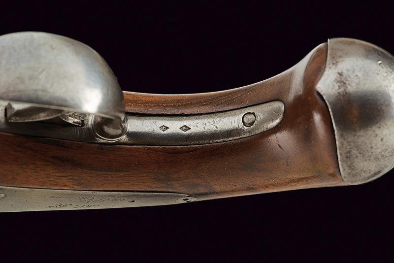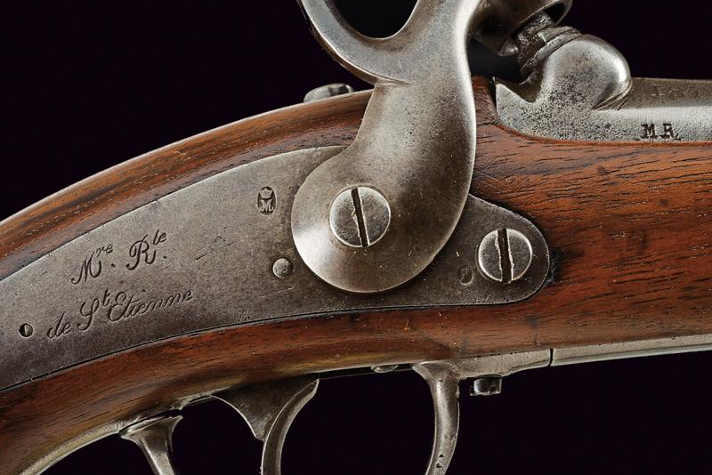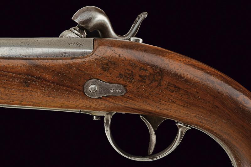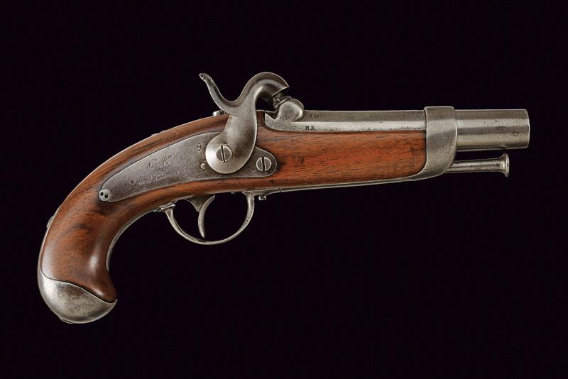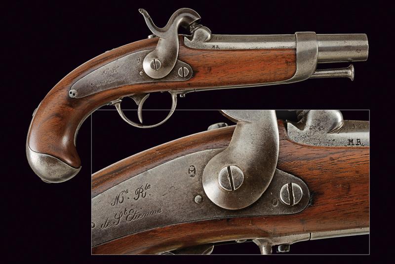 Pistola a luminello Mod. 1842 da gendarmeria, datazione: Metà del XIX Secolo provenienza: Francia, Canna tonda liscia con base ottagonale, punzonata 'MR' e con resti di altri marchi e numerazioni. Cal. 15,4 mm. Codolo con resti di datazione '1842'. Batteria a molla indietro punzonata con 'M' sormontata da corona e con marcatura 'M.re R.le de St. Etienne'. Meccanica funzionante a un solo scatto. Fornimenti in ferro con punzoni 'P' e 'G' entro losanghe. Bacchetta in ferro. lunghezza 24 cm.