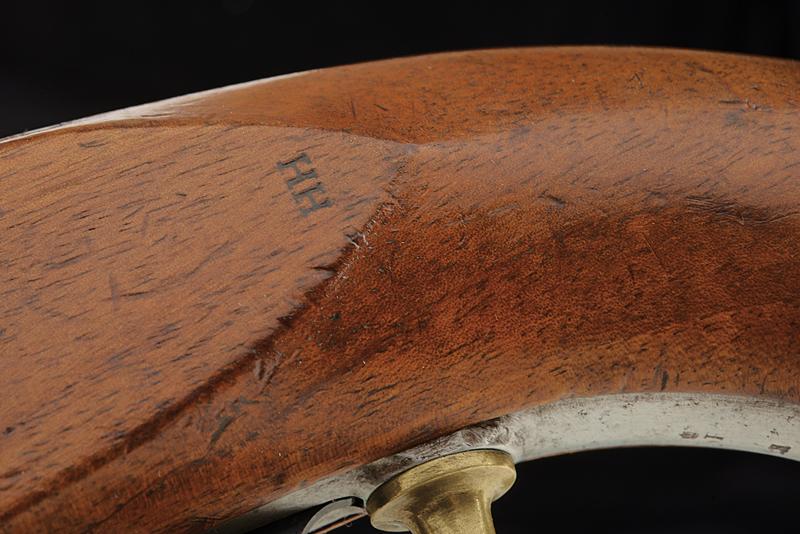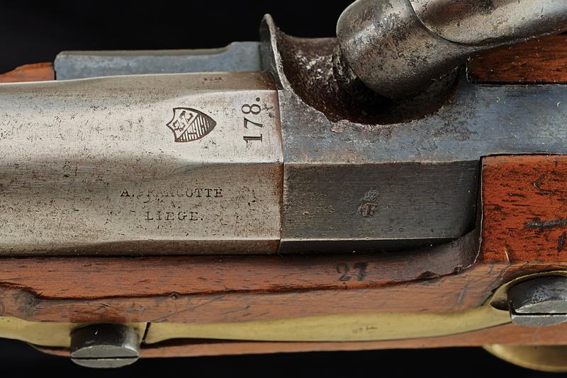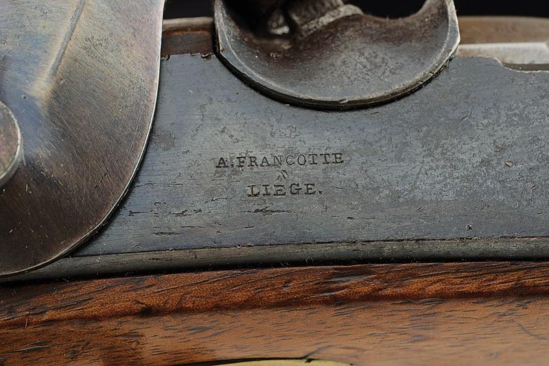 Pistola a luminello da cavalleria Mod. 1842 di Francotte, datazione: Metà del XIX Secolo provenienza: Svizzera, Canna tonda liscia dotata di mirino, con base ottagonale recante numerazione, marchio a scudo, resti di marcatura di Francotte. Cal. 17,9 mm. Culatta con punzone 'AF' coronato. Batteria con brunitura color blu (antica?) presente anche sul cane e sul codolo. La cartella marcata 'A. FRANCOTTE LIEGE'. Meccanica funzionante. Mezza cassa in legno punzonata 'HH'. Collo con dorso in ferro marcato 'AF'. Fornimenti in ottone con vari punzoni. lunghezza 35 cm.