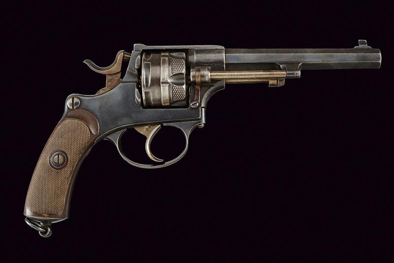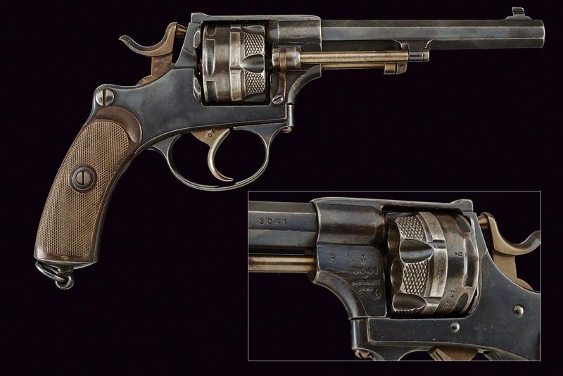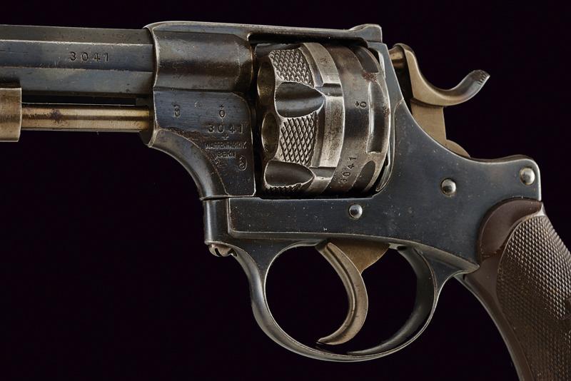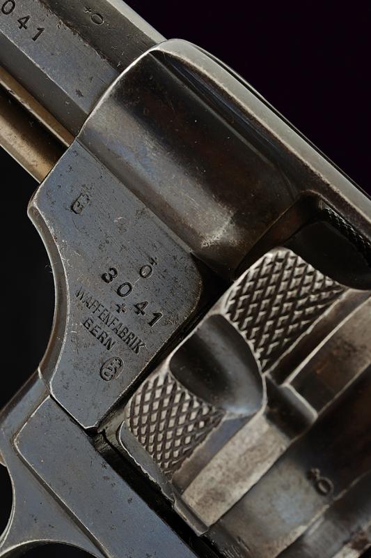 Revolver Mod. 1872/78 a percussione centrale, datazione: 1875-1890 provenienza: Svizzera, Canna ottagonale rigata, dotata di mirino, cal. 10,4 mm. Tamburo scanalato a sei colpi, parzialmente zigrinato. Castello marcato 'WAFFENFABRIK BERN', con punzoni svizzeri. Guancette in bachelite zigrinata, una con croce svizzera al centro, anello porta correggiolo. Brunitura rinfrescata. Matricola '30xx' su canna e castello. lunghezza 30 cm.