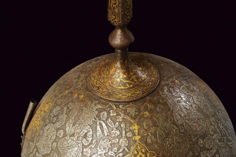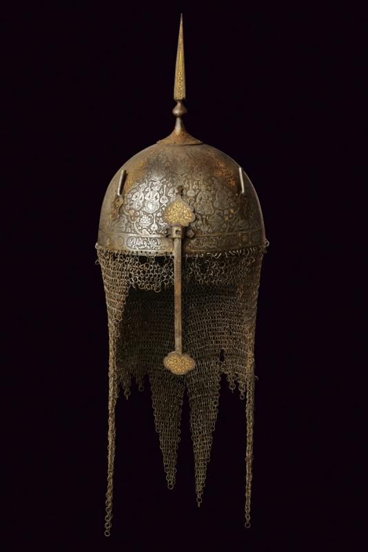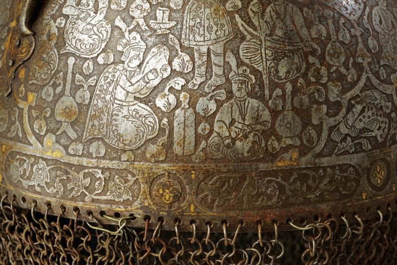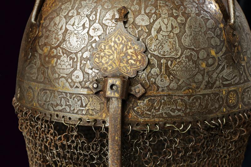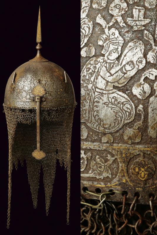 Khula Khud, datazione: Inizio del XIX Secolo provenienza: Indopersia, In ferro, coppo emisferico con puntale, due pennacchiere e nasale scorrevole con passante. Decorato da incisioni raffiguranti figure di musicisti, strumenti musicali ed uccelli, piccoli cartigli con decori rimessi in oro a koftgari. Camaglio ad anelli semplici, terminante in punte. altezza 56 cm.