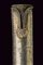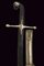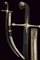 Shamshir con fornimenti in argento, datazione: fine del XVIII Sec. provenienza: Turchia, Ampia lama curva a un filo, in fine damasco wootz, a facce piane. Elso in argento con bracci dritti incisi a motivi geometrici e terminanti ad oliva. Guancette in corno bruno. Banda centrale con scanalature longitudinali. Pomo con fornimento in metallo a goccia e sforatura. Fodero in legno con rivestimento in pelle cucito in filo metallico. Cappa in argento con cornicette, incisioni floreali e Tughra. Lungo puntale in argento con cornicette incise, anche questo recante Tughra. Due campanelle di cui una punzonanta. lunghezza 90 cm.