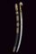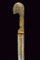 Shasqua con fornimenti in argento, datazione: Prima metà del XX Secolo provenienza: Georgia, Lama curva a un filo e breve controfilo con largo sguscio centrale e scanalatura vicino al dorso, la base e la scanalatura con incisioni dorate con un cosacco, un aquila e motivi decorativi. Bella impugnatura rivestito di lamina d'argento lavorato a puntini e decorato con bande ornate in niello. Fodero in legno rivestito di cuoio con fornimenti in argento inciso , niellato e decorato con piccole perle in osso a cabochon. Un anello ed un passante di sospensione. lunghezza 93 cm.