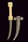 Kandshar, datazione: XIX Secolo provenienza: Impero Ottomano, Lama curva a due fili leggermente costolata in mezzeria in fine damasco. Impugnatura in avorio di tricheco (piccole mancanze). Bel fodero in legno rivestito completamente in argento riccamente inciso a motivi floreali e geometrici. Due passanti per la cintura. lunghezza 34 cm.