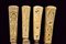 Lotto di quattro kard, datazione: XVIII/XIX Secolo provenienza: Persia, Tutti differenti, con lame in damasco, tre con decorazioni in oro. Tutti con guancette in avorio riccamente scolpite con figure, le fasce tutte decorate in oro. Foderi in legno, tre ricoperti di cuoio ed uno con resti di tessuti in policromia. Piccoli danni e mancanze. lunghezza 25.5 - 32.5 cm.