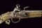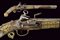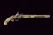 Pistola a pietra focaia, datazione: XIX Secolo provenienza: Balcani, Canna liscia a due ordini, ottagonale e tonda, recante alla base due punzoni ricoperti in ottone, uno coronato, l'altro con effige di un animale. Cal. 15,8 mm. Batteria alla morlacca funzionante, ornata parzialmente con intagli a racemi e delineature. Cassa intera in legno. Fornimenti in ottone e argento riccamente incisi o lavorati in rilievo a racemi. Piccole mancanze, segni d'uso e del tempo. Sotto all'impugnatura in fornimento ad anello. Bacchetta in ferro parzialmente ricoperta d'argento. lunghezza 52,5 cm.