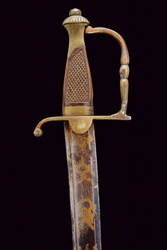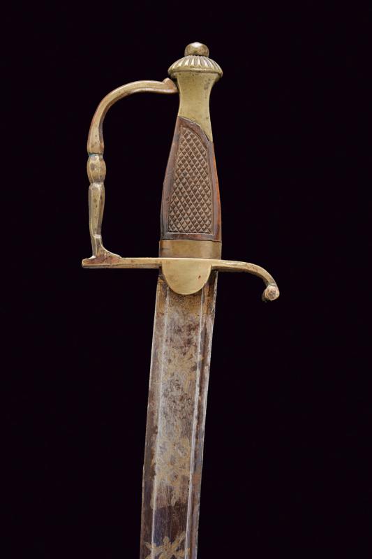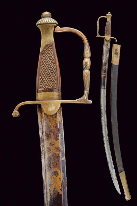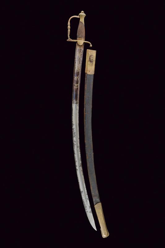 Sciabola adottata nel 1833 per aiutanti e guardarmi delle piazze, datazione: Metà del XIX Secolo provenienza: Piemonte, Larga lama curva a un filo e controfilo con ampio sguscio centrale e sottile scanalatura dorsale, la base inciso e dorato su fondo blu a trofei e motivi floreali. Fornimento monoelso in ottone, impugnatura con guancette zigrinate in legno. Completa di fodero in cuoio con fornimenti in ottone, gancio con croce Sabauda. lunghezza 95 cm.