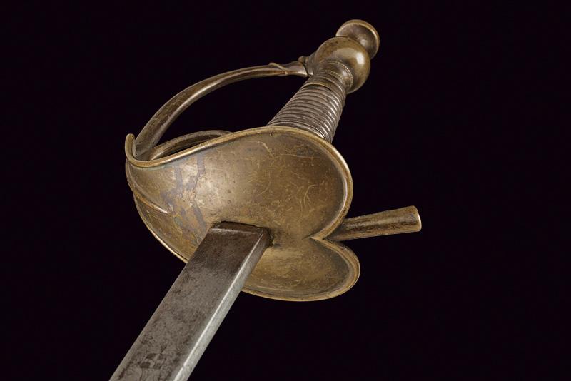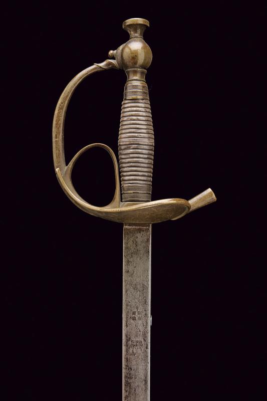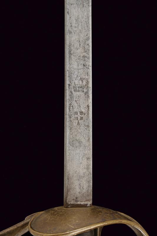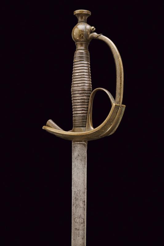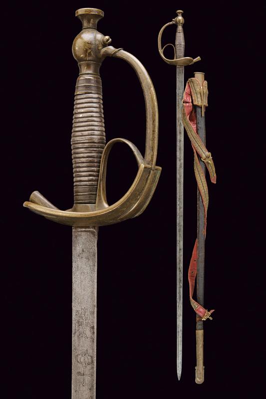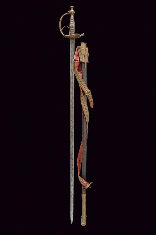 Spada Albertina mod. 1833, datazione: Metà del XIX Secolo provenienza: Piemonte, Lama dritta a un filo e controfilo con sguscio centrale che si doppia verso il debole, la base piatta, incisa con aquila Sabauda sotto corona. Tipico fornimento in ottone con impugnatura rivestita in lamina d'argento. Fodero in cuoio con fornimenti in ottone con attacco con cintura foderata in marocchino rosso. lunghezza 103 cm.