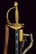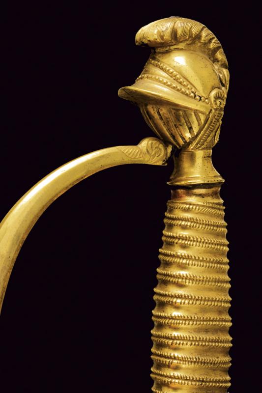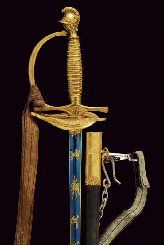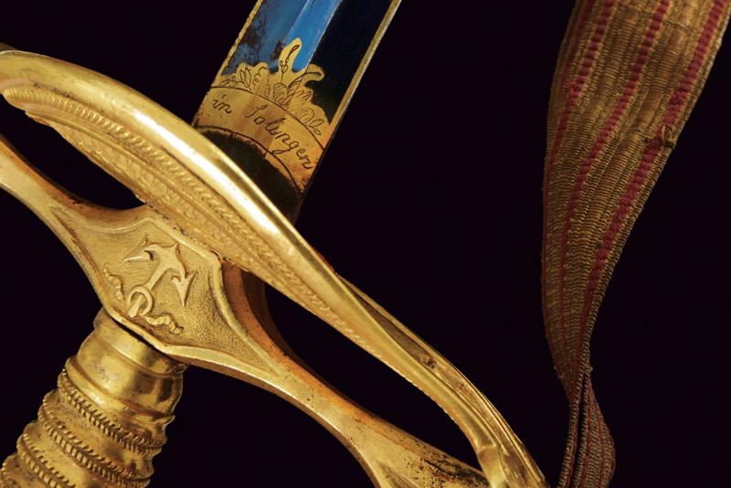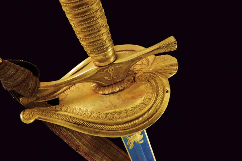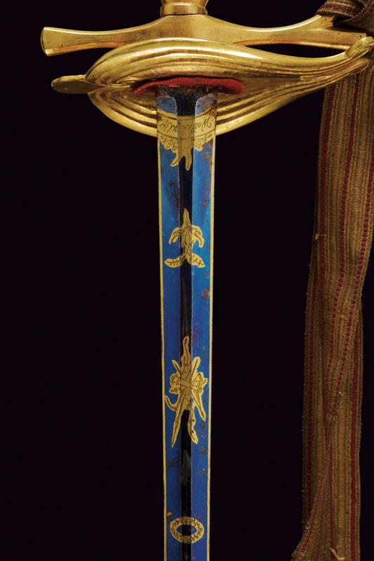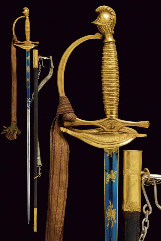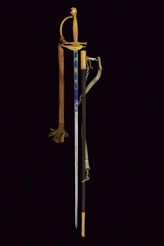 Spadino da ufficiale dell'Ordine Navale di Santo Stefano, datazione: Metà del XIX Secolo provenienza: Granducato di Toscana, Lama dritta a due fili di sezione esagonale, recante al forte piccole incisioni floreali e a trofei ageminate in oro su fondo blu, marcata 'Wester & C.IE in Solingen' alla base; fornimento in bronzo dorato a mercurio, coccia a cuore con cornicette incise, elso con massello recante ancora in rilievo, pomo a elmo con cimiero, impugnatura in bronzo incisa ad imitare la trecciola. Completa di dragona e fodero in cuoio con fornimenti in ottone dorato. Rara. lunghezza 100 cm.