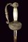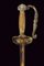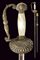Spada da dignitario, datazione: 1810 circa provenienza: Regno Italico, Lama dritta a un filo e controfilo con sguscio centrale, la prima parte incisa e dorata su fondo blu a trofei e motivi floreali, danni da ruggine. Fornimento alla francese in ottone argentato, pelta con ragnatela, pomo con busto, il resto decorato a motivi floreali. Impugnatura in legno con guancette in madreperla, quella posteriore mancante. Resti di fodero in cuoio con fornimenti in ottone, due anelli di sospensione. Rara. lunghezza 93 cm.