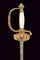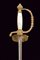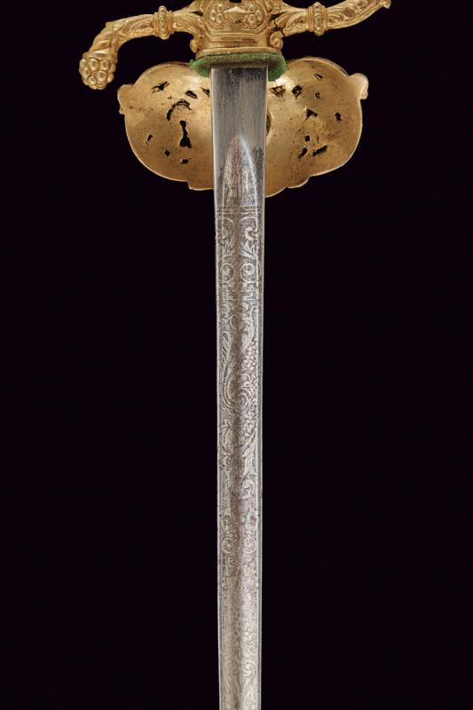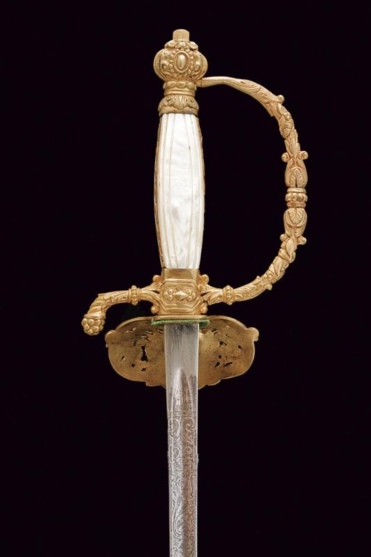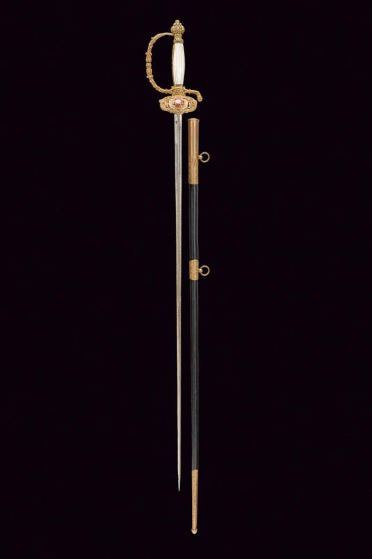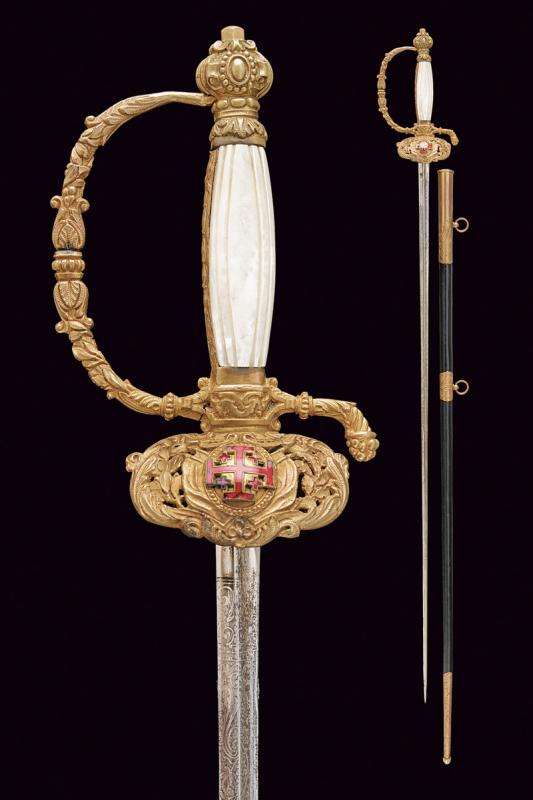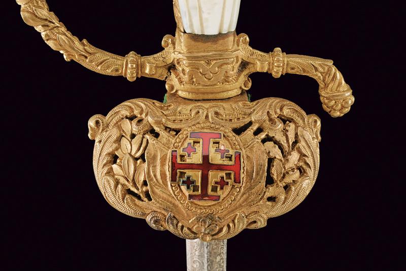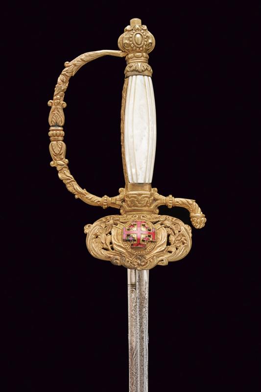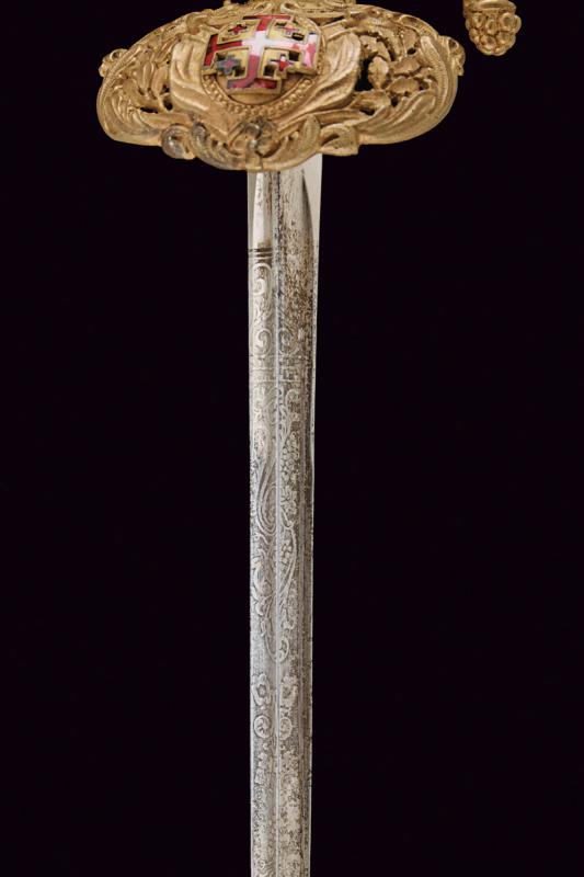Spadino dell'Ordine equestre del Santo Sepolcro di Gerusalemme, datazione: 1900 circa provenienza: Stato Pontificio, Lama di sezione triangolare, incisa a motivi floreali e con tiara; fornimento in ottone, la pelta traforata e con croce dell'ordine a smalti rossi (due piccole schegge), decorazioni floreali in bassorilievo; impugnatura in legno con guancette in madreperla; fodero in cuoio con fornimenti in ottone inciso a motivi floreali. Due anelli di sospensione. lunghezza 95 cm.