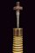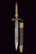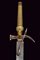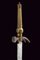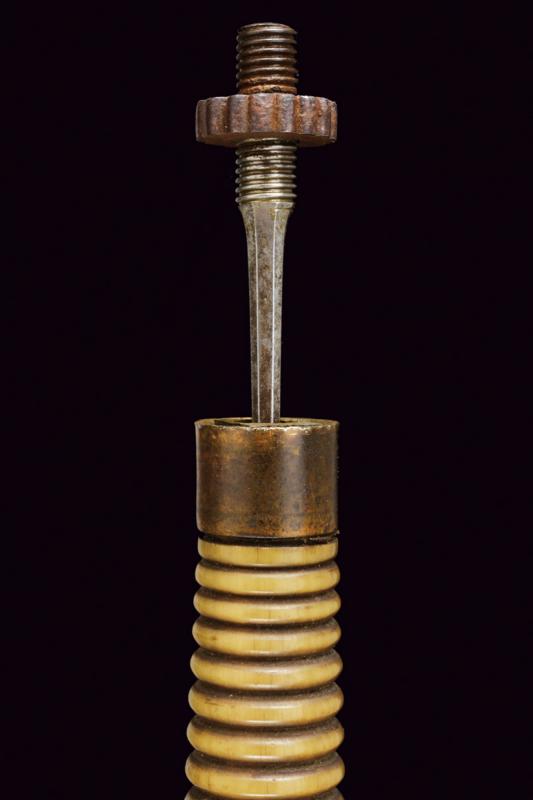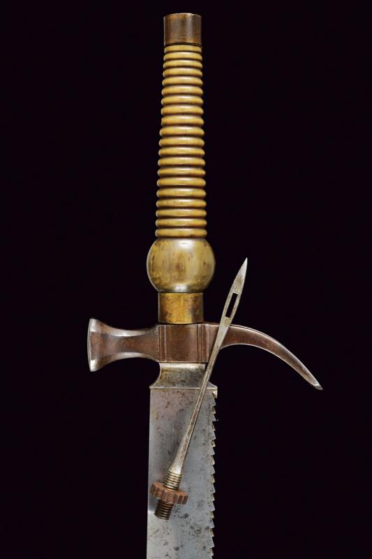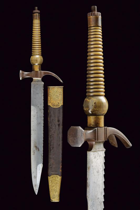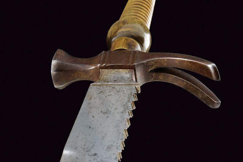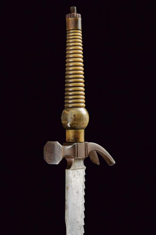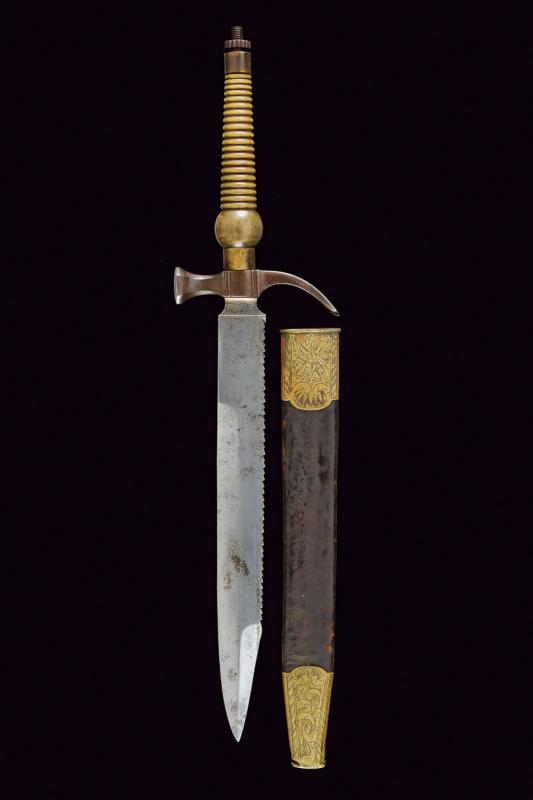 Rara baionetta a tappo con accessori, datazione: XIX Secolo provenienza: Europa, Lama dritta a un filo e punta, con dorso a sega e rastremata al tallone. Munita su un lato di sforatura per il bottone del fodero. Elso in ferro ben lavorato a martello, con bocca lievemente convessa e becco biforcuto. Impugnatura in corno con sfera e anellature. Il cappellotto svitabile cela un passacorda che può essere fissato all'impugnatura tramite la filettatura posta sul lato opposto. Ghiere in metallo giallo. Completa del suo fodero in cuoio. La cappa in metallo color ottone recante su una faccia grande gancio in ferro con sblocco a leva; la superficie tutta incisa a fiorami e cornicette e, sul lato opposto con un trofeo di lance ed armi caricato con scudo (probabilmente sabaudo). Il puntale leggermente schiacciato, inciso en suite a fiorami, rocaille e cornicette. lunghezza 43,6 cm.