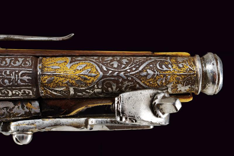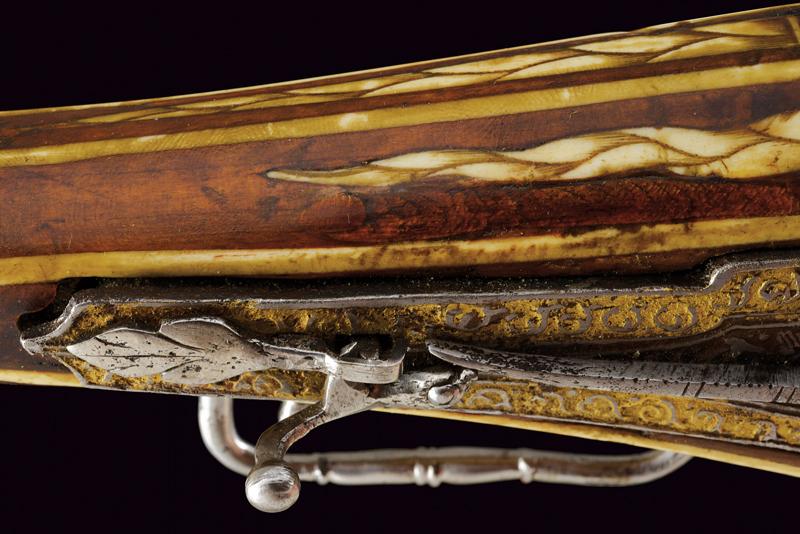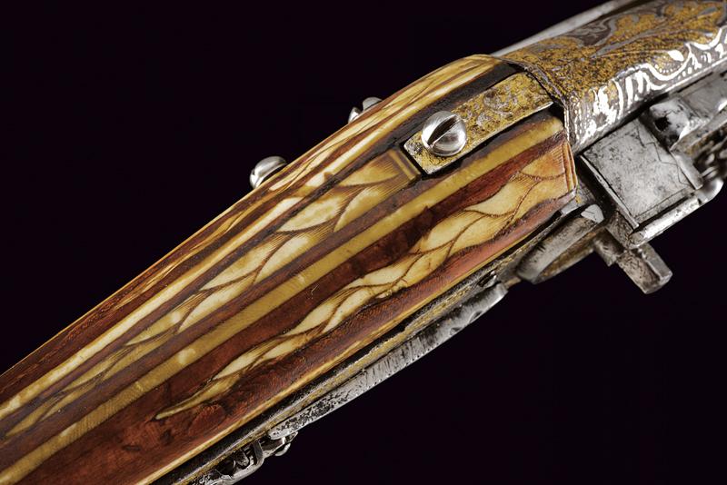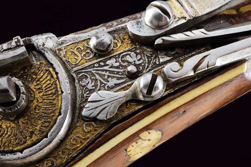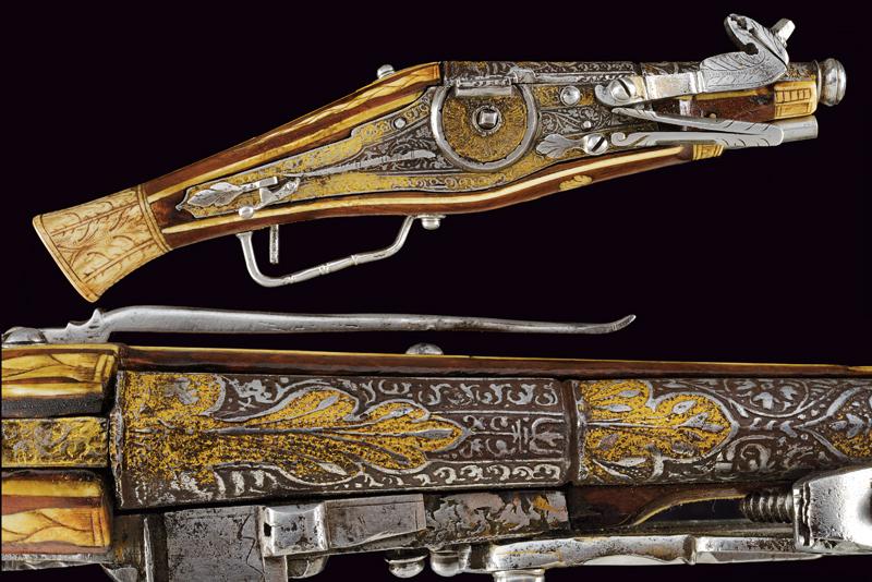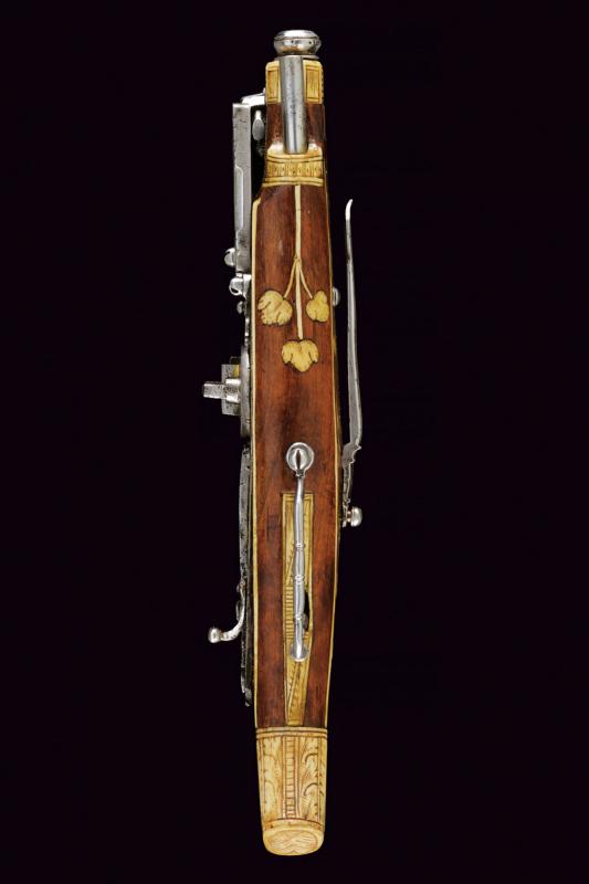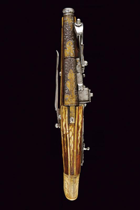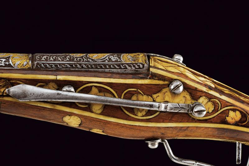 Rarissima pistola a ruota cinquecentesca, datazione: 1560 circa provenienza: Germania, Canna liscia a due ordini, prima ottagonale poi tonda e con gioia di bocca, incisa per tutta la lunghezza e parzialmente dorata su fondo scuro, cal. 10 mm; breve codetta angolata incisa e dorata. Batteria arcaica a ruota esterna completamente incisa a motivi floreali con bordo dorato, la ruota incisa e dorata in cornice liscia, copriscodellino scorrevole (scatto non funzionante, mancanza del fermo all'interno). Sicura intagliata ed incisa. Cane inciso e con resti di doratura alla base. Molla intagliata. Corta cassa (la batteria copre gran parte della lunghezza) in legno con fornimenti in osso incisi a motivi floreali e geometrici. Sottile ponticello in ferro decorato a balaustro nella parte centrale. Gancio da cintura in ferro leggermente intagliato alla base. Bacchetta in legno con battipalla in ferro. Le pistole a ruota di questa epoca sono molto rare. Provenienza: Collezione Mark Dinely, Inghilterra.Letteratura: 'Landeszeughaus Graz, Austria Radschloss Sammlung / Wheellock Collection', di Robert Brooker, 2007. La pistola a ruota RP 253 a pagina 106 reca una batteria di forma molto simile, anche se non decorata; soprattuto la forma del cane, la cartella, la cornice della ruota e la sicura appaiono dello stesso tipo e dello stesso periodo. lunghezza 30 cm.