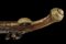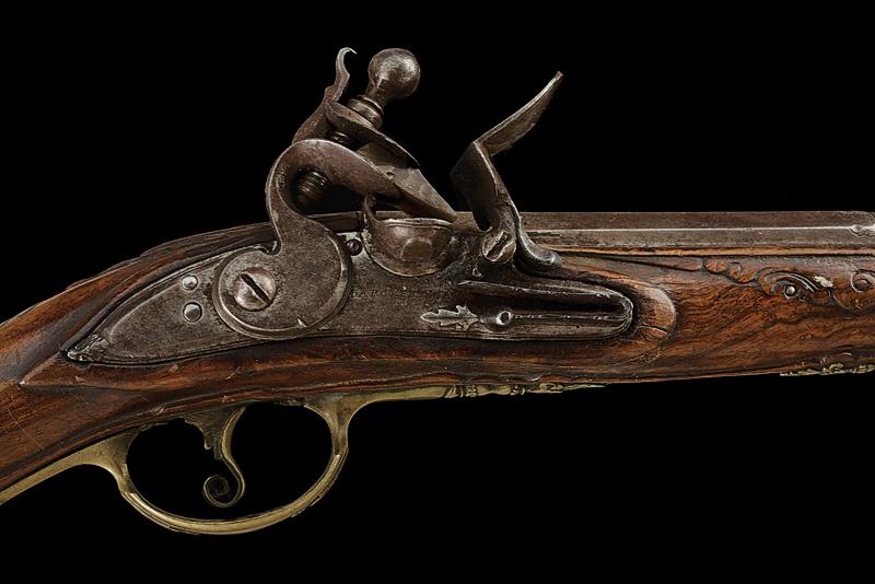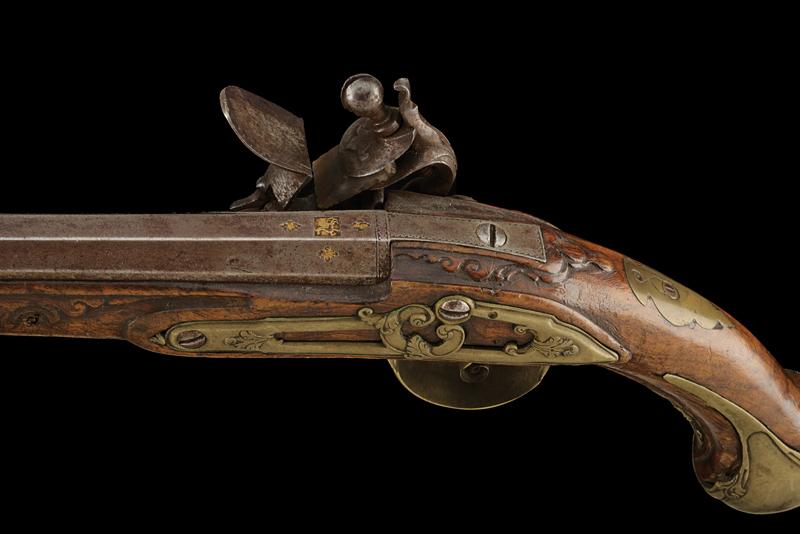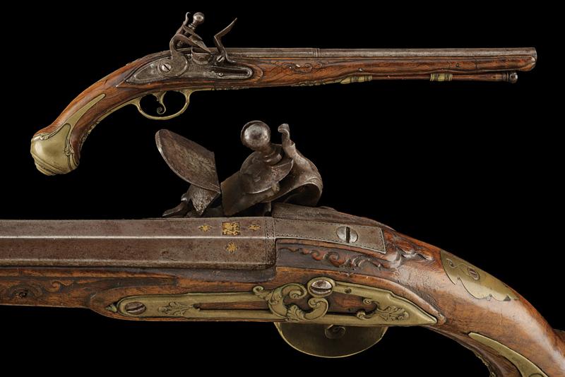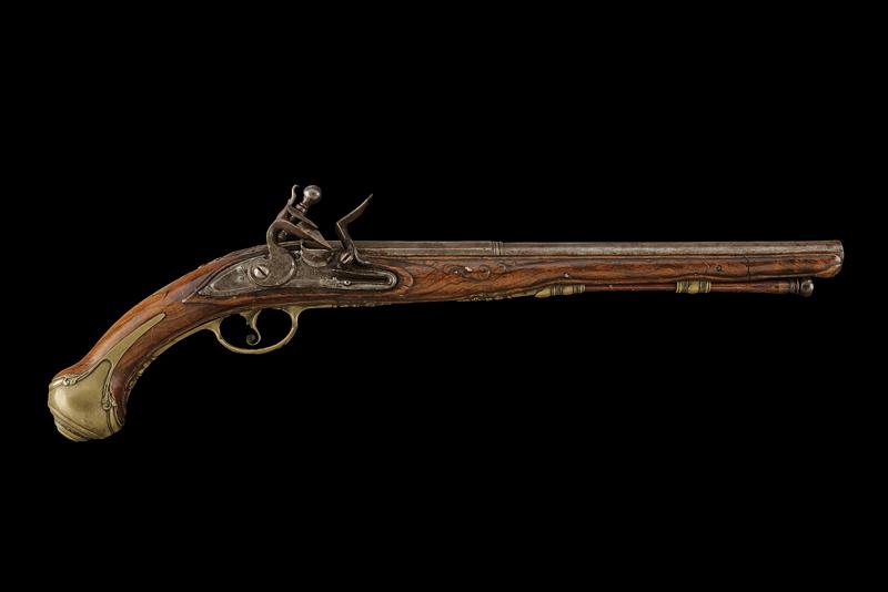 Pistola a pietra focaia di Marco Frusca, datazione: Metà del XVIII Secolo provenienza: Brescia, Lunga canna liscia a due ordini, la prima parte ottagonale con marca a cavallo tra quattro gigli rimessi in oro, la base incisa con cornice, dopo anelli tonda, cal. 13 mm; codetta incisa en suite. Batteria con bordo ribassata e decorata a foglie alla coda, al centro firma 'MARCO FRUSCA'. Cassa intera in legno (piccole mancanze e difetti) parzialmente scolpito. Eleganti fornimenti in ottone decorato con elementi floreali, la contropiastra traforata. Completa di bacchetta in legno con battipalla in corno. lunghezza 47 cm.