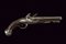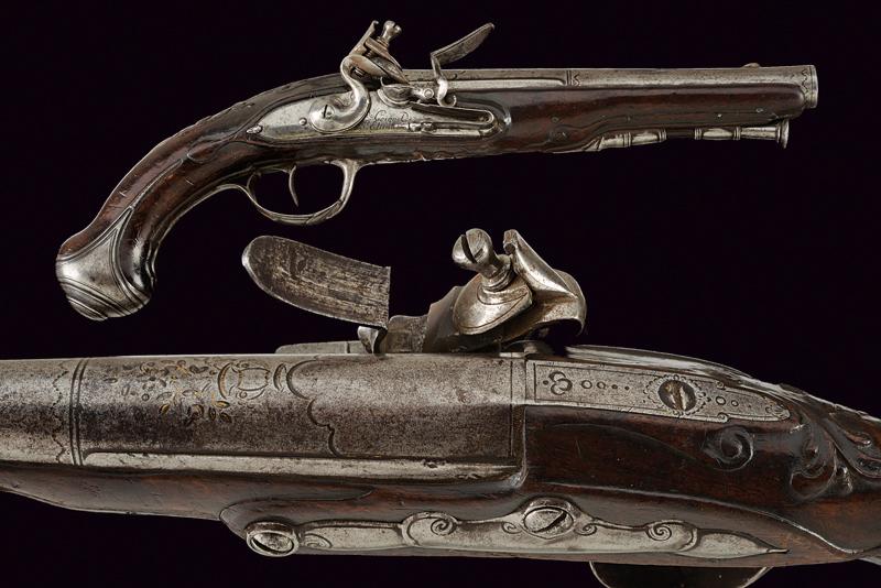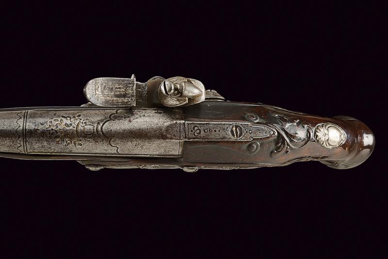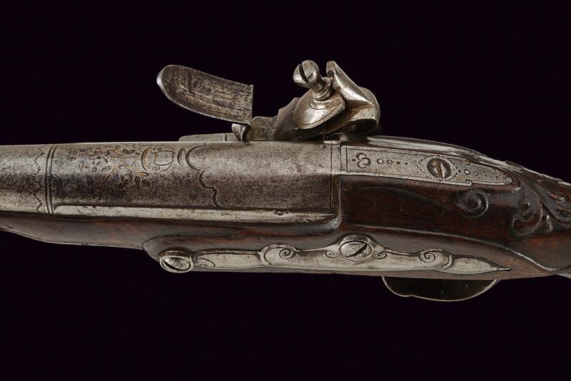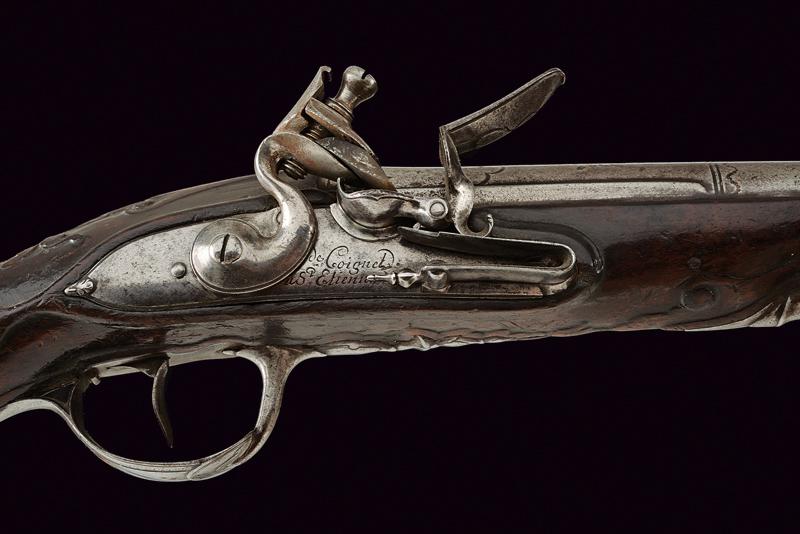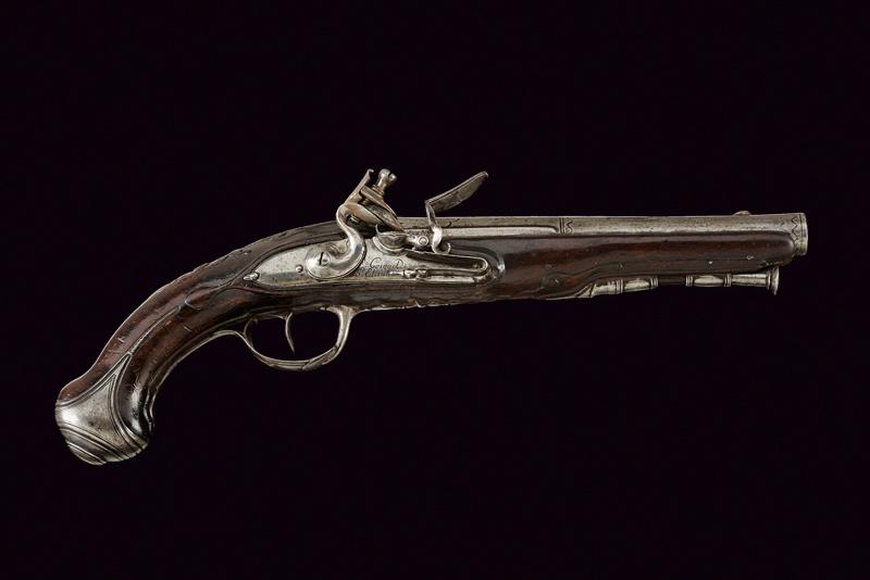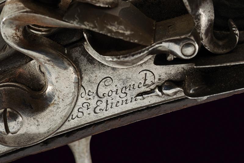 Pistola a pietra focaia di Claude Coignet, datazione: ultimo quarto del XVIII Sec. provenienza: St. Etienne, Canna liscia, tonda, con fini incisioni floreali e resti di rimessi in ottone, mirino in ottone, cal. 15 mm; codetta incisa; batteria firmata 'C.de Coignet a St. Etienne'; cassa intera in legno con fornimenti in ferro decorati come la batteria con cornici ai bordi. Bacchetta in legno con battipalla e cavastracci in ferro. lunghezza 32.5 cm.
