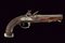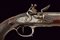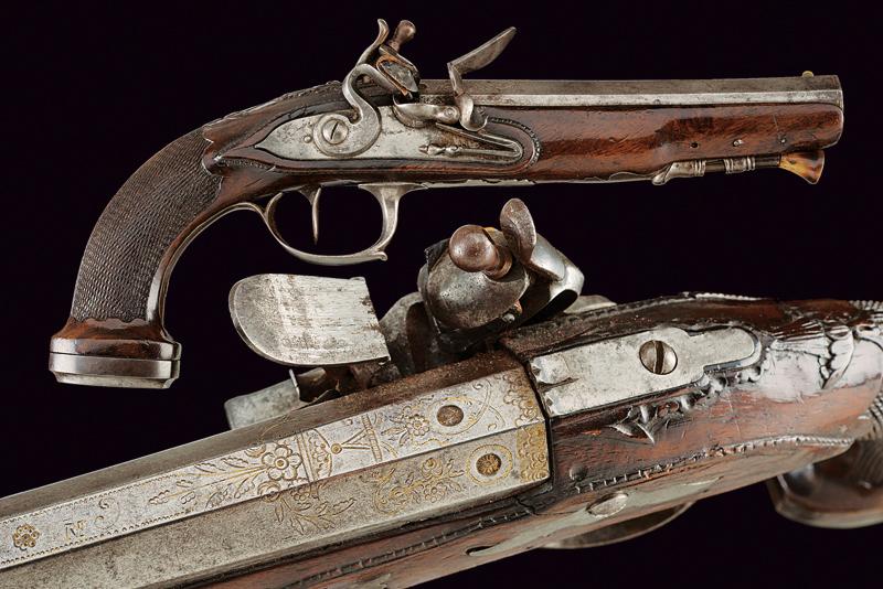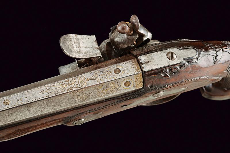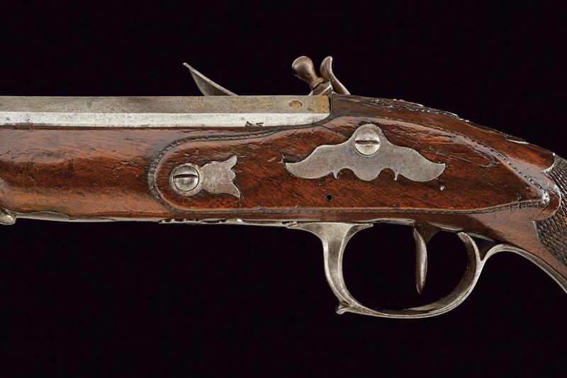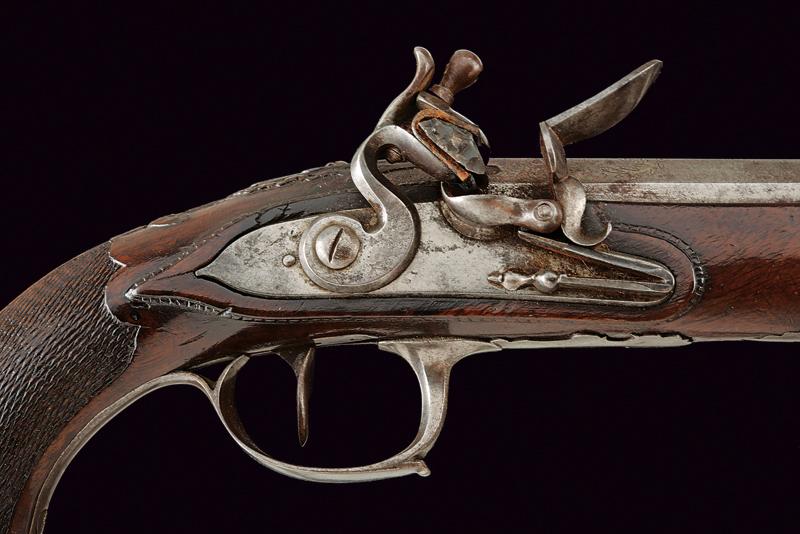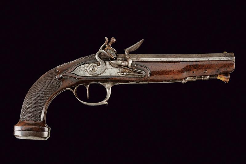 Pistola a pietra focaia da ufficiale, datazione: fine del XVIII Sec. provenienza: Francia, Canna ottagonale liscia, recante sulla superficie resti di incisioni dorate: alla base tre punzoni a palme incrociate circondati da disegni floreali e con un grande vaso al centro; la faccia superiore con resti di marcatura dorata 'CN TORDU'. Sul fianco sinistro punzone 'M' coronato. In volata mirino in ottone, cal. 17,2 mm. Codolo con traguardo fisso. Batteria a cartella piatta con scodellino a tenuta stagna. Meccanica funzionante. Cassa intera in legno. Impugnatura zigrinata. Il dorso con intaglio a vaso e cornicette. Fornimenti lisci in ferro. Bacchetta in legno con battipalla in corno e cavastracci in ferro. lunghezza 30 cm.