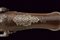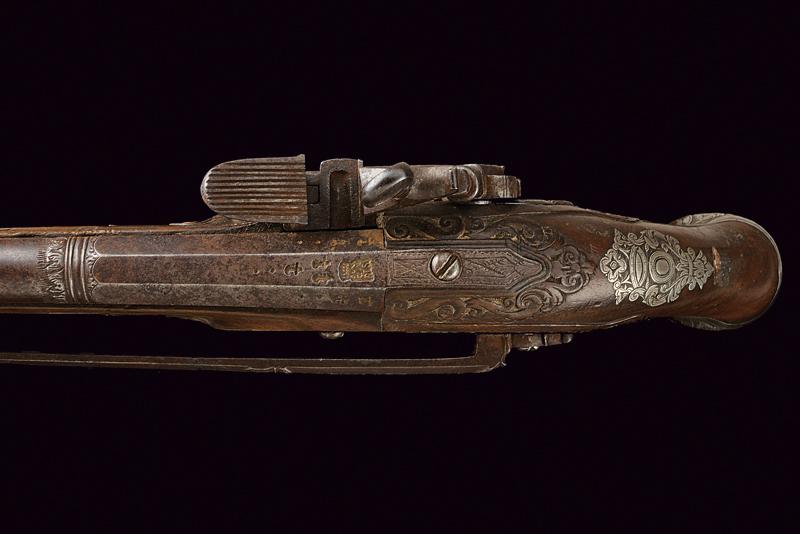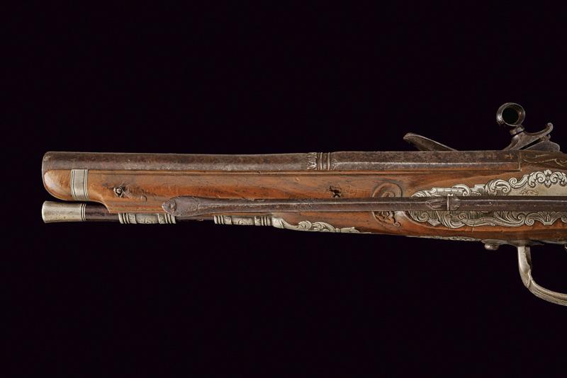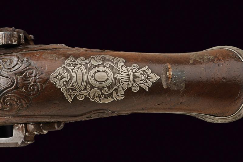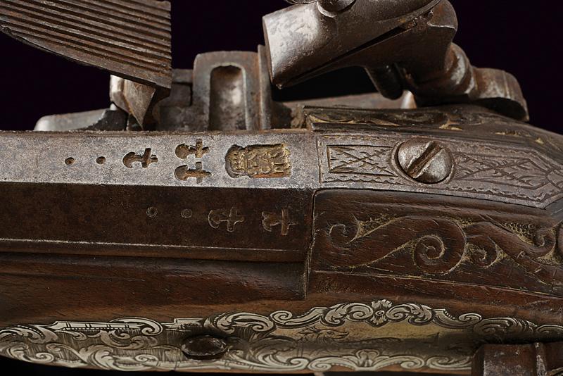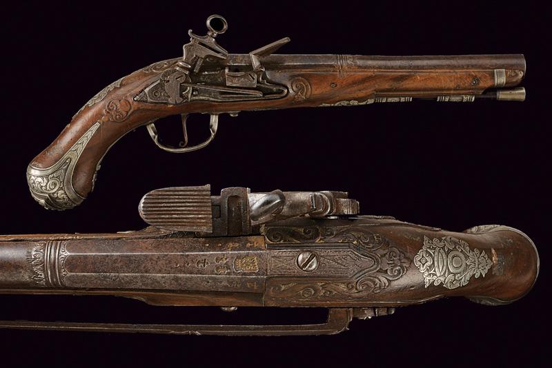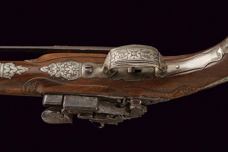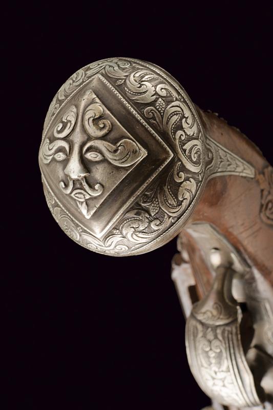 Bellissima pistola a pietra focaia con fornimenti in argento, datazione: XVIII Secolo provenienza: Napoli, Canna liscia a due ordini, la prima parte ottagonale con profondo punzone poco leggibile rimesso in ottone tra sciabole stilizzate, dopo anelli e foglie d'accanto tonda, cal. 16 mm; codetta incisa. Bella batteria alla micheletta con eleganti incisioni floreali, la coda intagliata a fogliame. Cassa intera in legno leggermente scolpito con fini fornimenti in argento riccamente inciso a motivi floreali, la coccia con bellissimo mascherone in altorilievo. Lungo gancio da cintura in ferro con intagli floreali. Bacchetta in legno con battipalla in argento e cavastracci in ferro. In patina. lunghezza 38.5 cm.