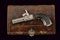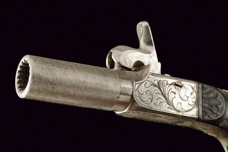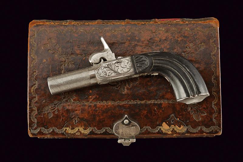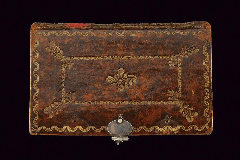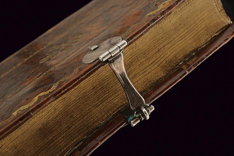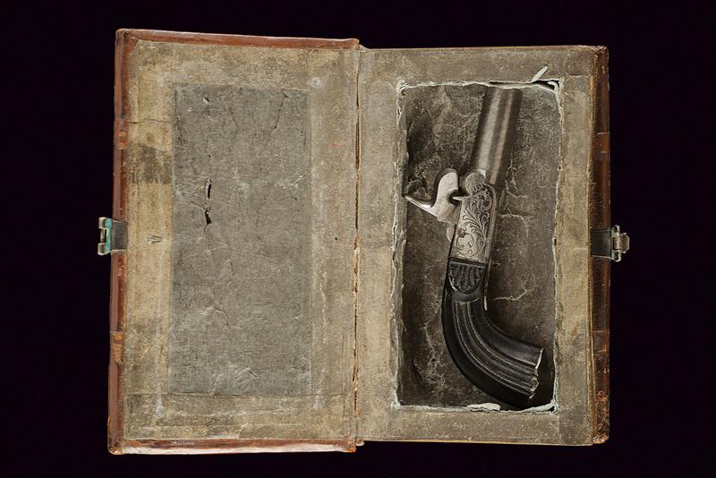 Mazzagatto a luminello con custodia a libro, datazione: Metà del XIX Secolo provenienza: Europa, Canna cilindrica microrigata, cal. 8,5 mm. Castello in ferro con incisioni a racemi, grilletto a scomparsa, meccanica funzionante. Calcio in ebano intagliato a foglie e sgusciato. In una curiosa custodia realizzata con un libro antico. Con pagine a bordo dorato incollate e scavate in modo da ottenere uno scomparto interno per la pistola. La copertina in cuoio con cornici a impressioni recanti resti di doratura e completa di fermo di chiusura in argento. lunghezza 11,3 cm.