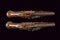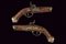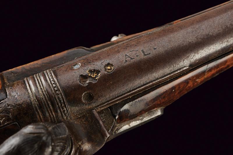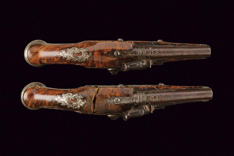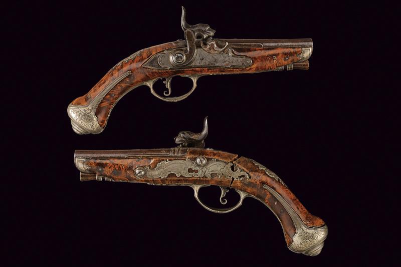 Paio di pistole da viaggio ridotte a luminello, datazione: 1800 circa provenienza: Italia o Francia, Canne lisce, tonde con vari anelli lisci o perlinati alla base, piccolo punzone fra tre fiori con resti di doratura seguito da 'A. L.', cal. 11 mm; codette sagomate ed incise. Batterie ridotte a luminello con cane a pesce. Casse intere in radica (una con rottura da restaurare) con bellissimi fornimenti in argento inciso a motivi floreali. Bacchette in legno. lunghezza 21 cm.