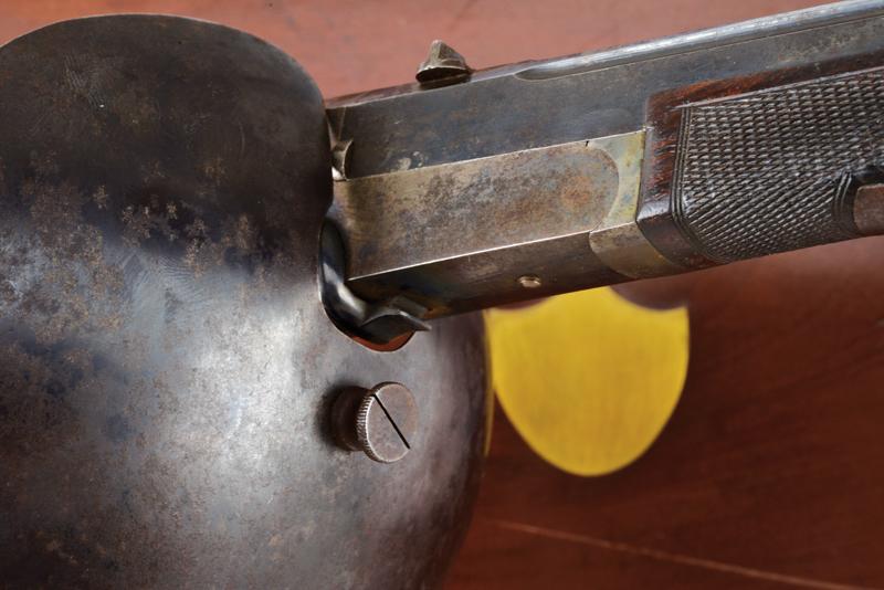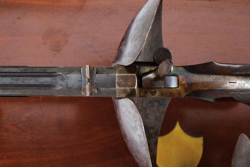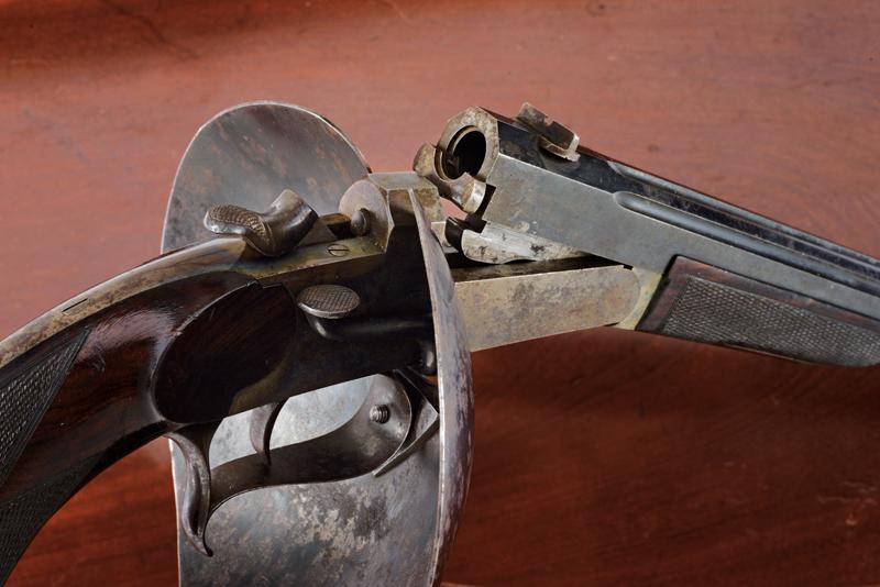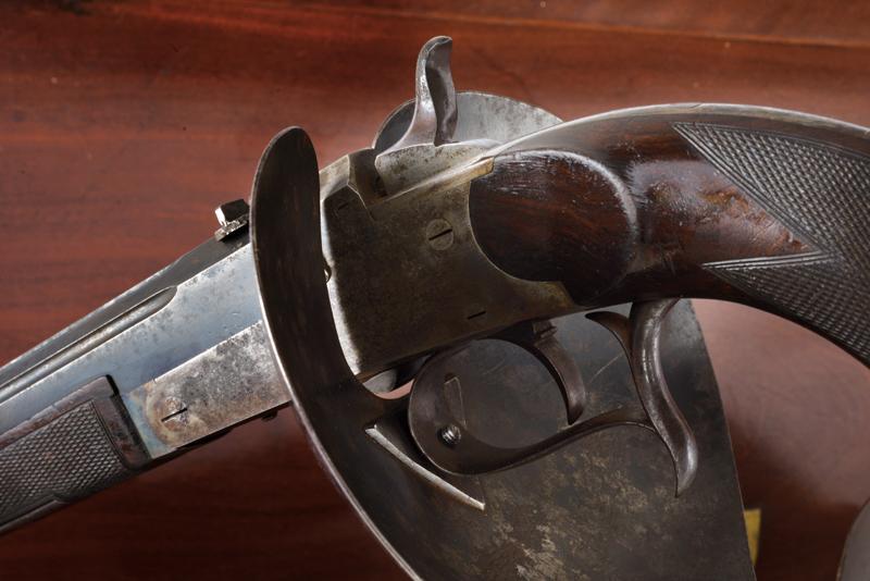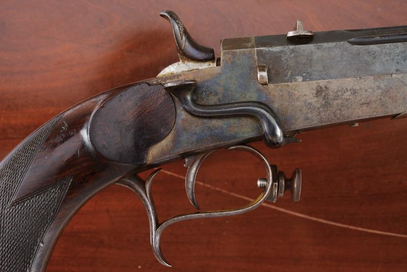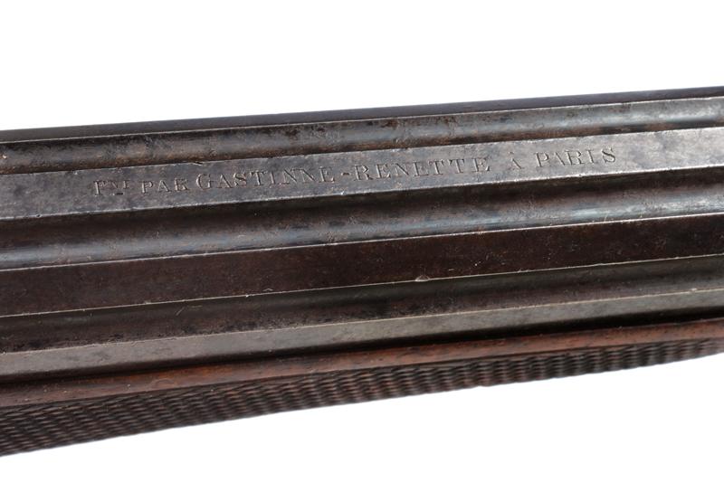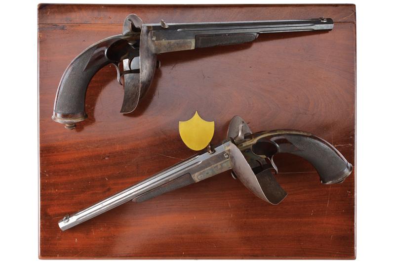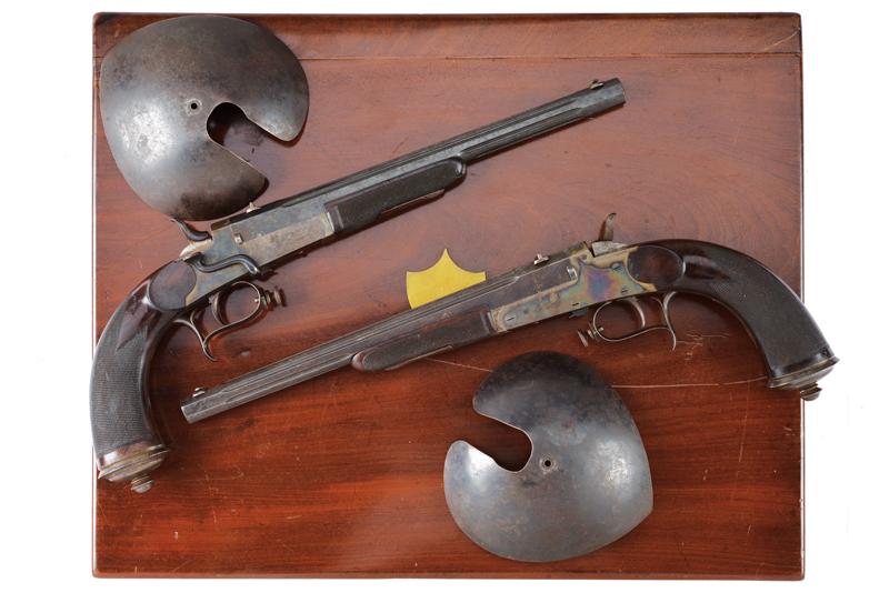 Paio di pistole a retrocarica a tiro di Gastinne Renette in cassetta, datazione: 1870 circa provenienza: Parigi, Canne ottagonali decorate a scanalature, rigate (anime in buoni condizioni, la rigatura ben visibile), sopra marcate 'F.NI PAR GASTINNE RENETTE A PARIS', con alzo e mirino, brunite, cal. 11 mm; castello liscio in acciaio con resti di brunitura, leva d'apertura sul lato destro, cane posteriore. Calcio ed astina in legno micro-zigrinato; fornimenti in ferro, ponticelli con poggiadito e vite nella parte anteriore, dove va montata una valva di protezione. Nella loro cassetta in legno con scudetto sul coperchio e maniglie a scomparsa laterali in ottone. L'interno rivestito di velluto bordeaux con le due valve di protezione e alcuni accessori inclusa la chiave. Raro paio di pistole da tiro del noto fabbricante Gastinne Renette. lunghezza 43.5 cm.