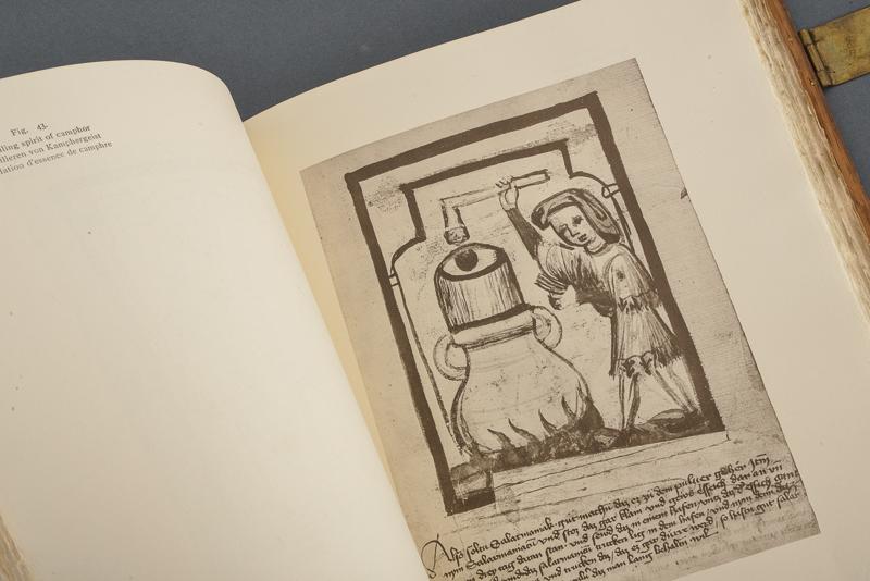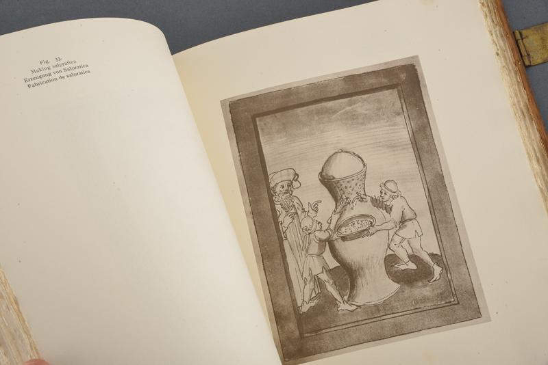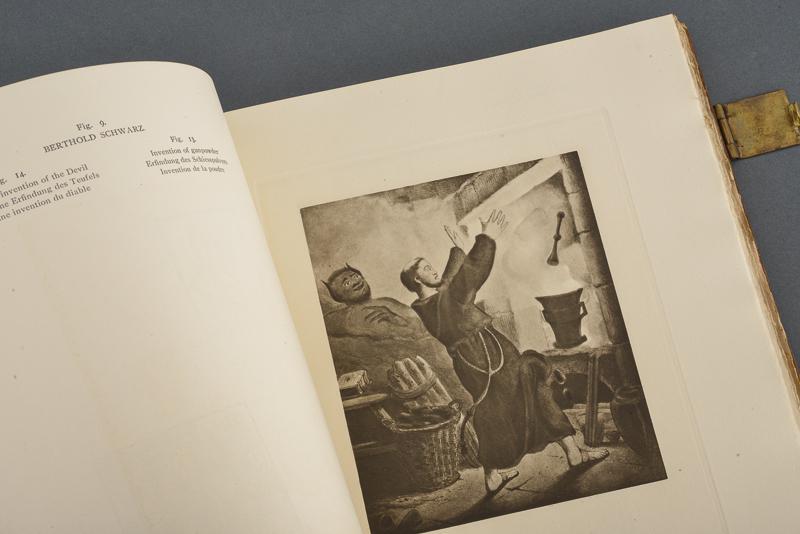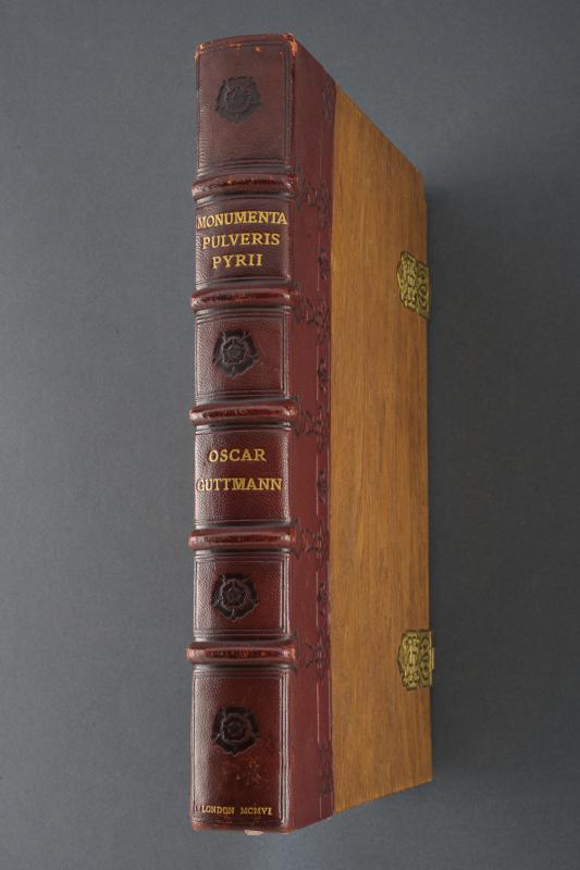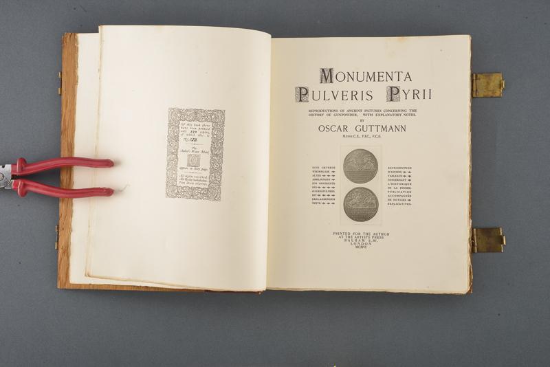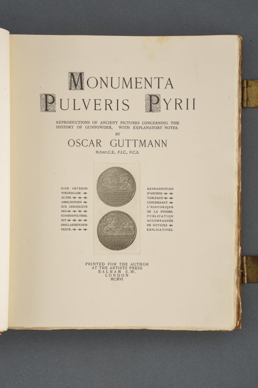 Guttmann, Oscar, datazione: 1906 provenienza: Londra, 'Monumenta Pulveris Pyrii - Reproduction of Ancient Pictures concerning the History of Gunpowder', Printed at the Artists Press, Balham, London, MCMVI. 32 pagine testo in lingua inglese, tedesca e francese e 102 tavole. Esemplare 125 di solo 270. Bellissima copertina in legno con dorso in cuoio, titolo in oro e chiusura in ottone dorato ed inciso. Ex libris 'Claude Blair' con firma. altezza 33.5 cm.