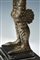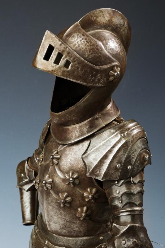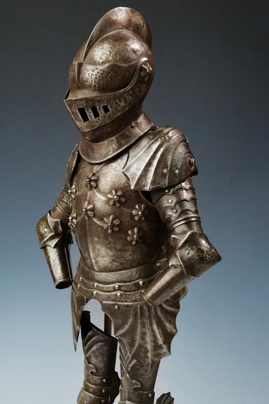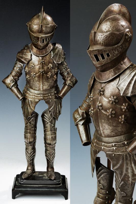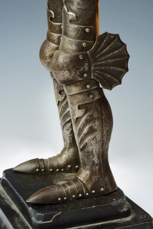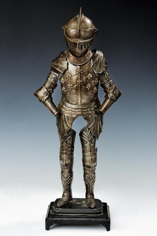 Miniatura di armatura con elmo chiuso, datazione: XIX Secolo provenienza: Germania, In ferro, completo di tutte le parti, incluse le manopole. Piccole mancanze, alcuni pezzi da fissare. Bella esecuzione. Su una base in legno laccato di nero. altezza 57 cm.